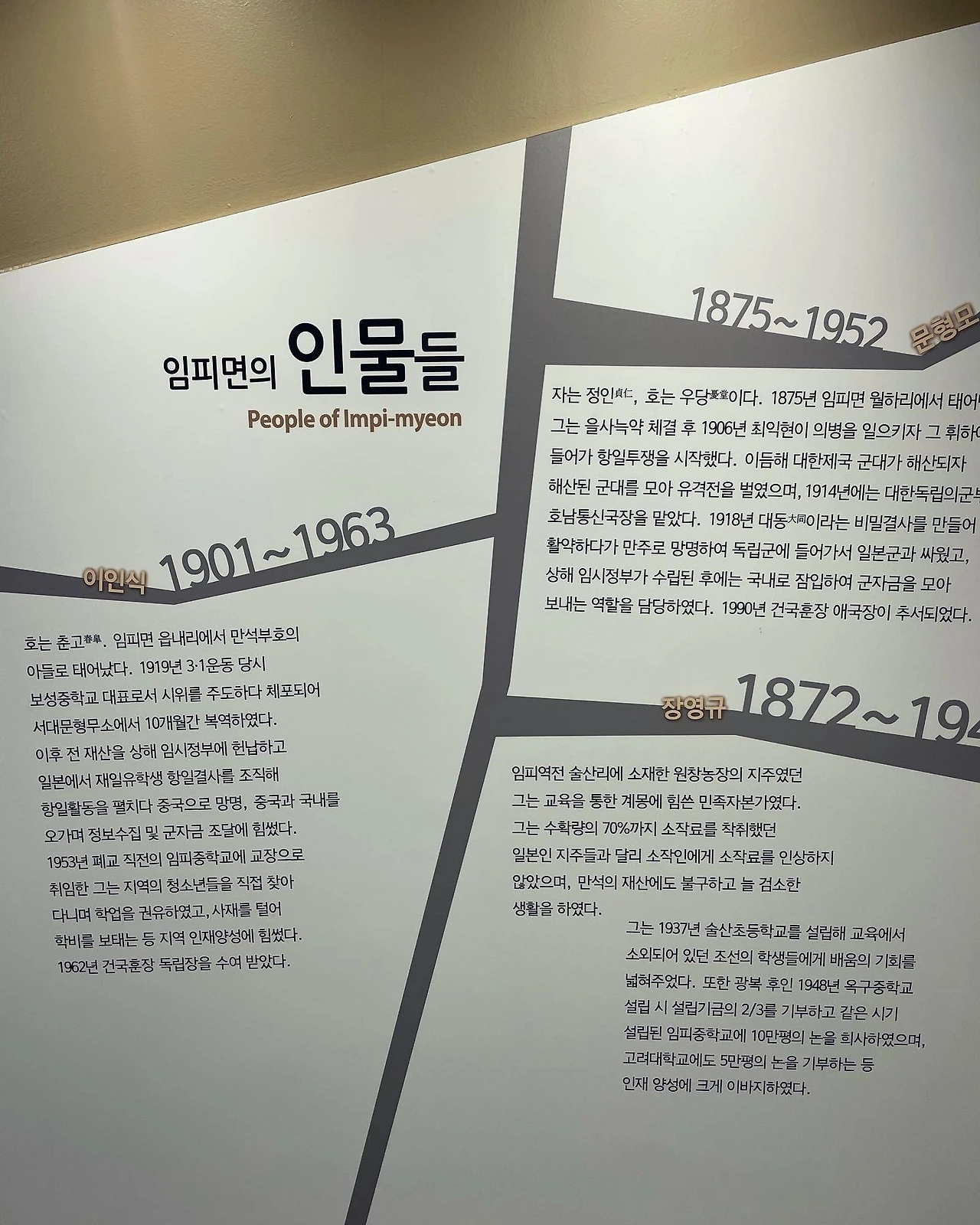 마침 일제 수탈의 관문이던 임피역에 임피면 인물소개가 있었다. 만석부호의 아들로 태어나 3.1 운동 당시 보성중학교 대표로 시위하다 감옥에 갔고, 이후 전 재산을 상해 임시정부에 헌납하고 독립운동에 힘보태다가, 해방 후 임피중 교장으로 취임해 사재를 털면서 아이들을 키워낸 이인식 선생.