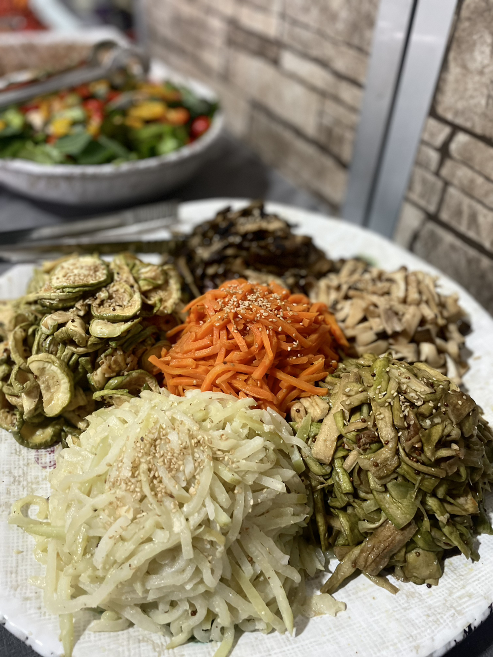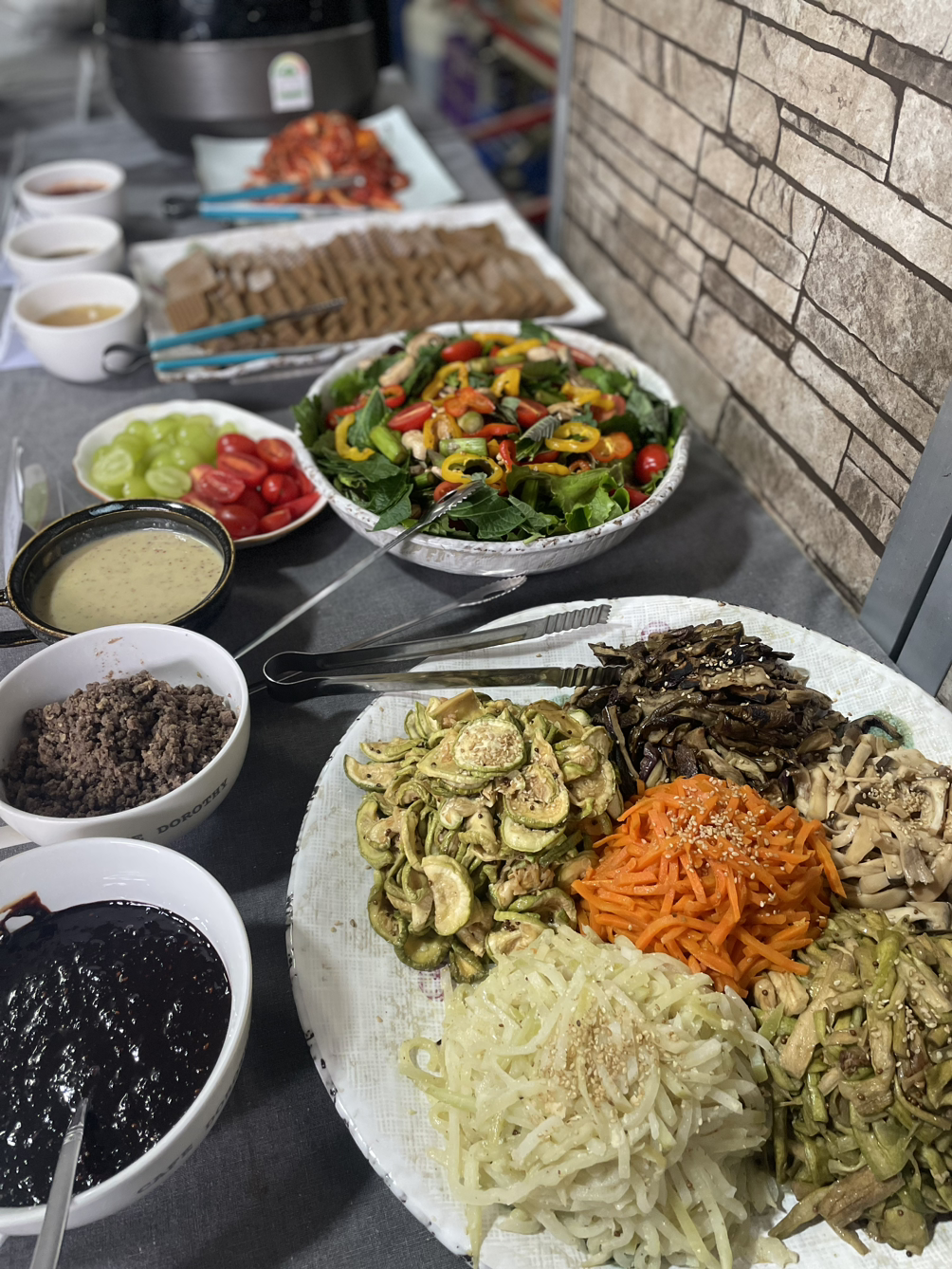 수랏간 나인 팀은 좀 일찍 모였는데, 리더인 ㅈㅎ님이 전날밤 2시까지 재료 밑작업을 싹 다 해놓으신 덕에 일이 별로 없었다. 말린 호박과 가지, 무와 당근, 토란대와 버섯 등 6가지 나물에 비빔밥. 몇몇 나물은 청장(참치액젓+꽃게액젓+조선간장)으로 감칠맛을 냈는데, 필히 담에 저거 해봐야지. 고추장에 고춧가루, 매실청, 참기름으로 사과를 두 개나 갈아넣은 비빔장도 독보적이다.