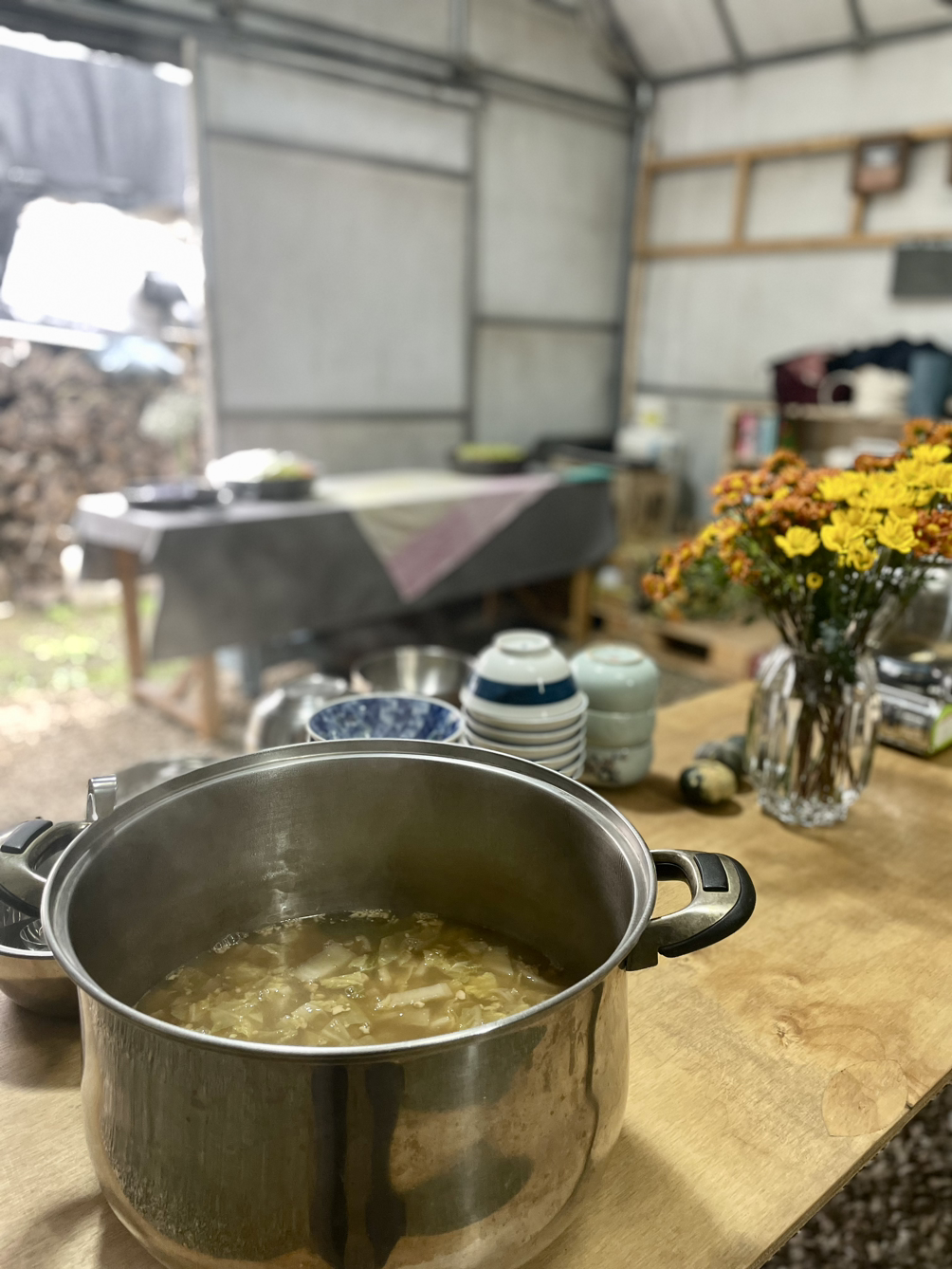 가마솥에 장작불로 푹 끓인 된장배춧국도, 역시 사과 갈아넣어 깊은 단맛을 낸 겉절이도 어제 밭에서 뽑은 배추의 여러 버전. 도저히 참지 못하고 국을 2.5그릇 먹었다. 두그릇에 끝내려다, 막판에 가마솥에 남은 배춧국 들통에 붓는데 풍미에 넘어갔다. 이건 맛이 다르지.