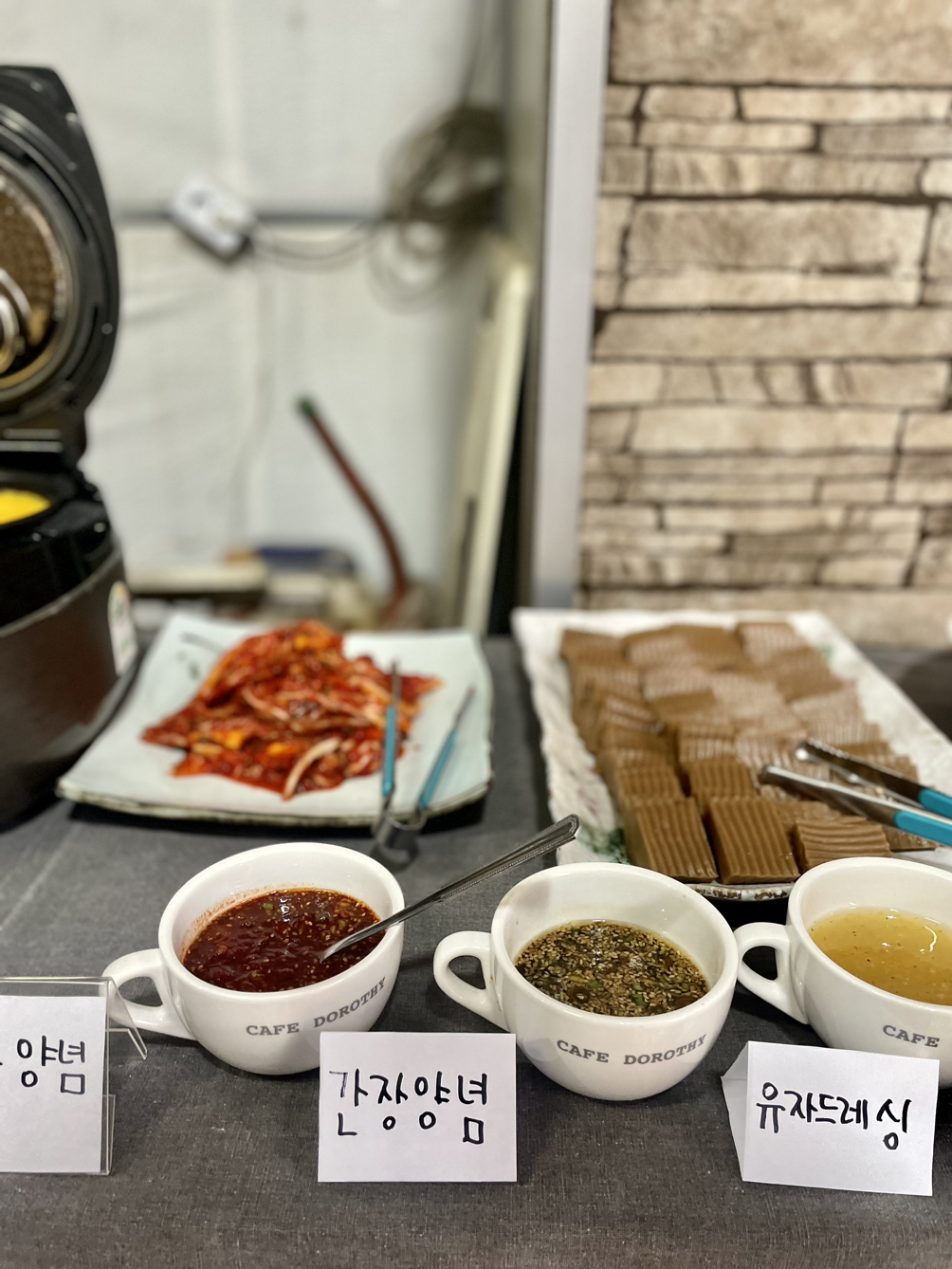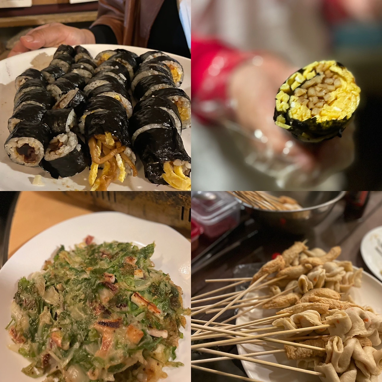 박고지김밥, 계란어묵김밥, 어묵꼬치, 기막힌 오징어무침 곁들인 충무김밥, 지글지글 갓 부친 전으로… 사진 찍을 겨를 없이 김밥 마는대로 사라졌다.