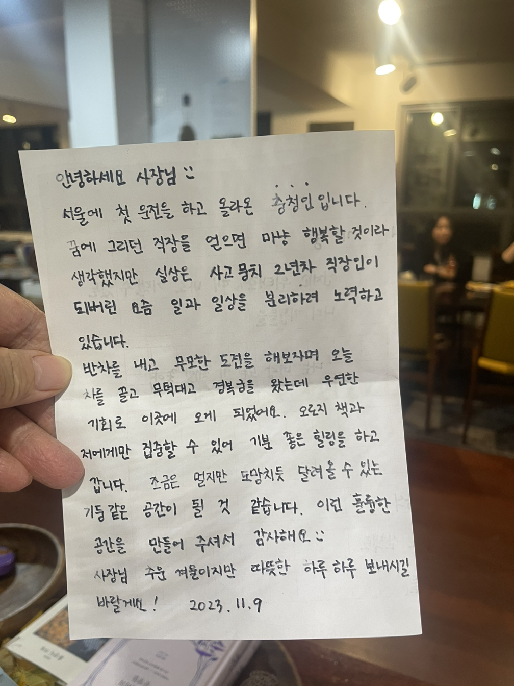 엊저녁 어느 손님이 남기고 간 메모도 서점 알바로서 기뻤다. 기분 좋은 힐링을 얻고 가셨다고, 따뜻한 메모를 별말 없이 종이를 반으로 접어 쟁반에 두신 덕분에 하마터면 버릴 뻔. 이 서점, 알바 뿐 아니라 당연하게도 손님에게도 든든하다. 넘 좋잖아.