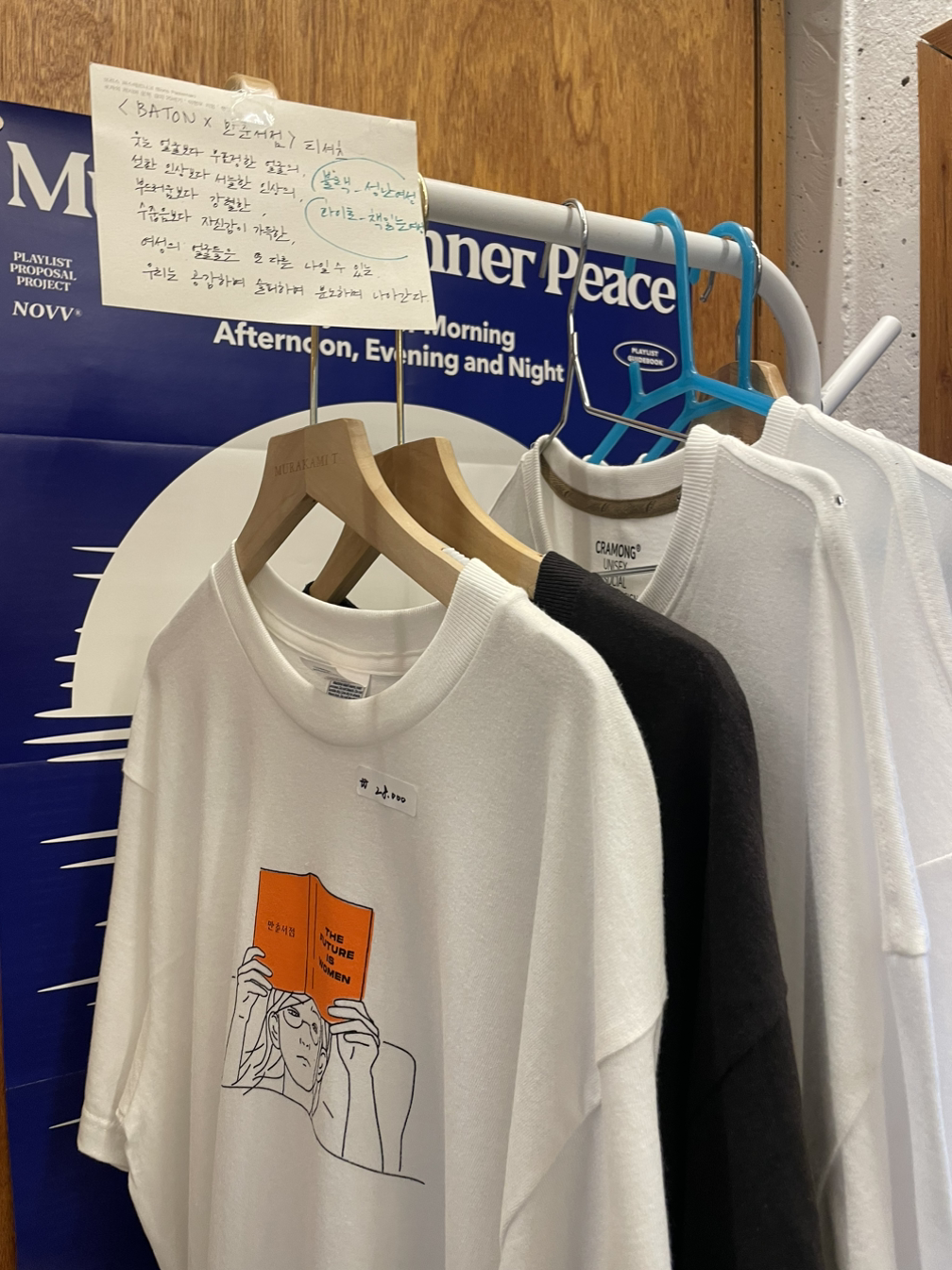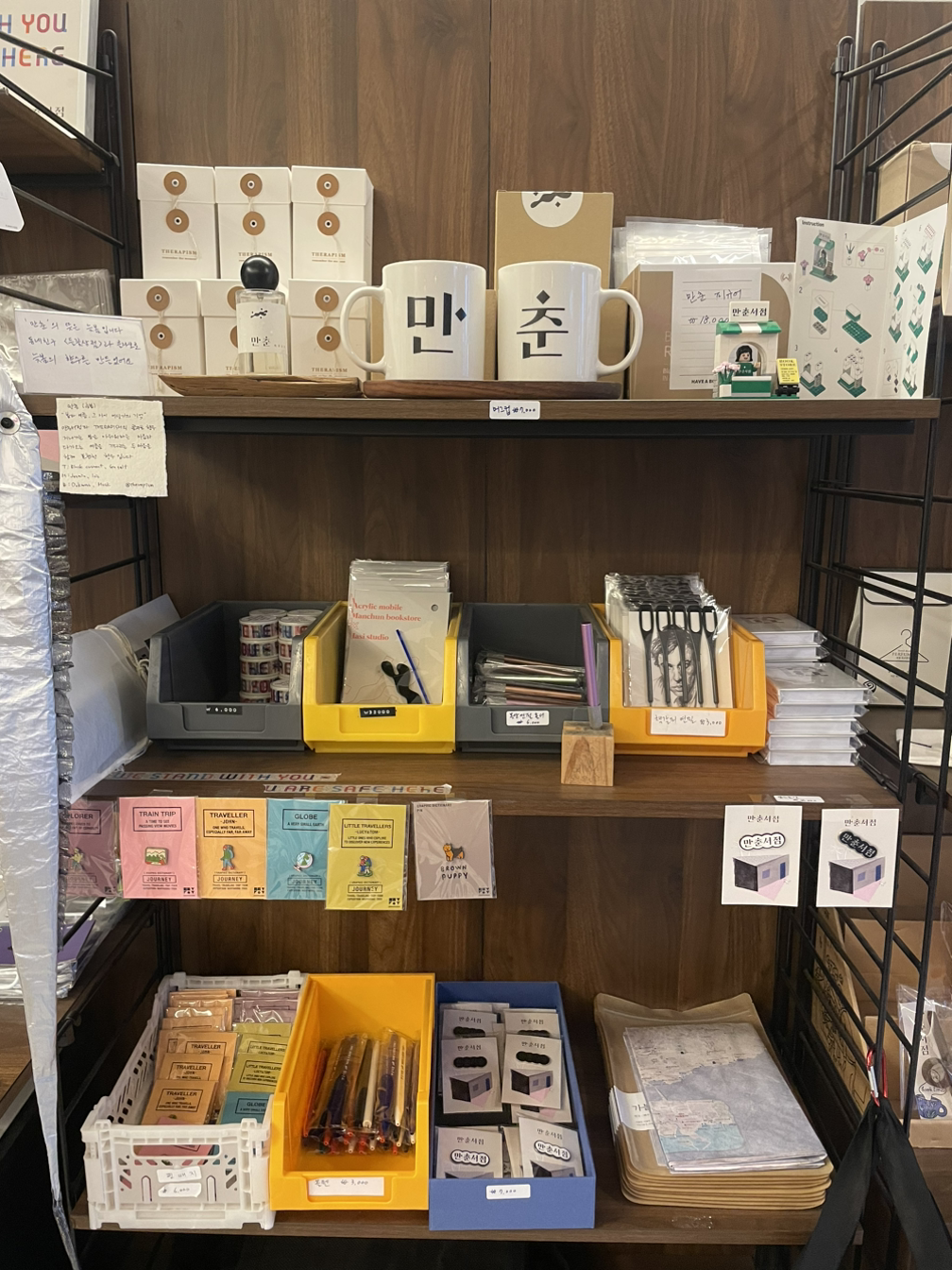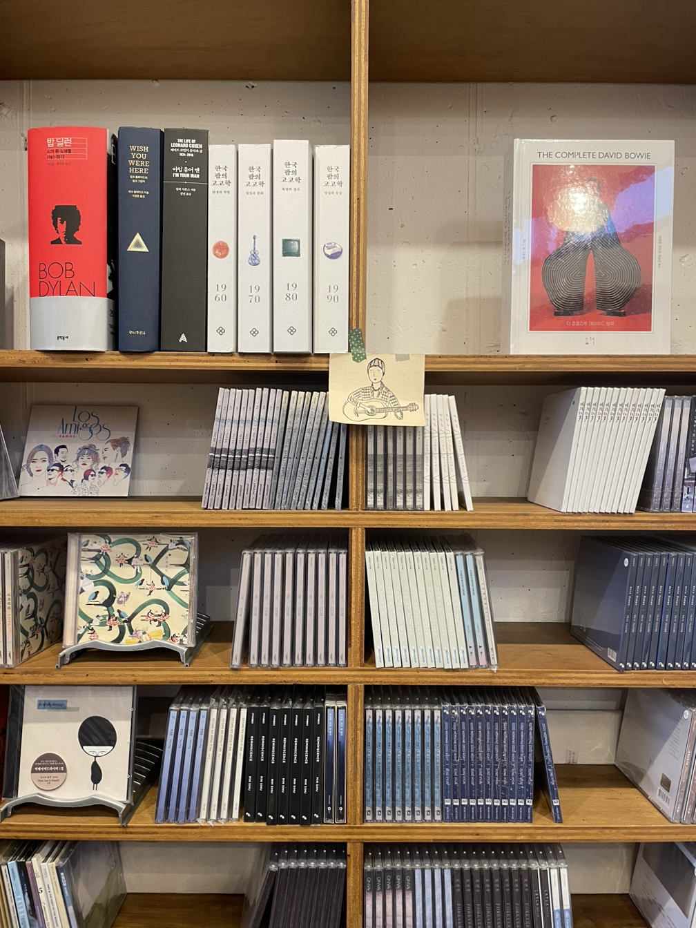 늦봄이라는 뜻의 만춘서점은 공간 두개를 쓴다. 음악 책들 큐레이션에 반한 남편이 크고 무거운 고가의 책을 골랐다. 이런건 흔쾌히 사줄 수 있다. 훨씬 더 두꺼운 밥 딜런과 데이빗 보위 책은 넘어갔다. 다른 플레이어들과 협업해 만춘서점 티셔츠, 향수 등 굿즈들 귀여운 편. 책들 틈에 에이징솔로 괜히 반갑고ㅎ