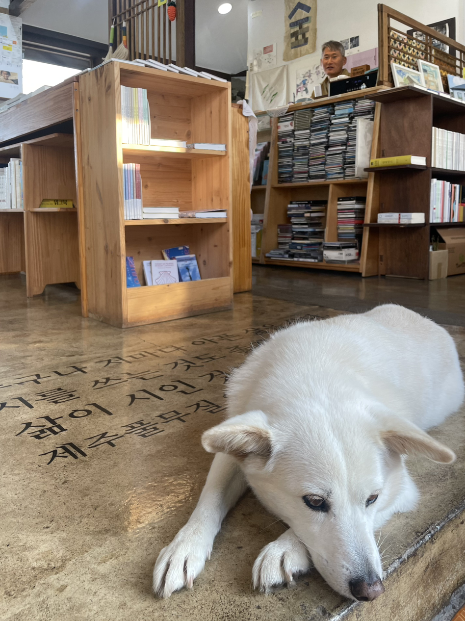 성균관대 앞에서 오래 버텼던 인문사회과학서점 풀무질 사장님은 제주 당근밭과 무밭 옆에 작고 예쁜 #제주풀무질 쥔장으로 변신했다. 문을 열면 정물화라는 별명 그대로 그린 듯이 누워있는 하얀개 광복이가 꼼짝도 않고 맞아준다.