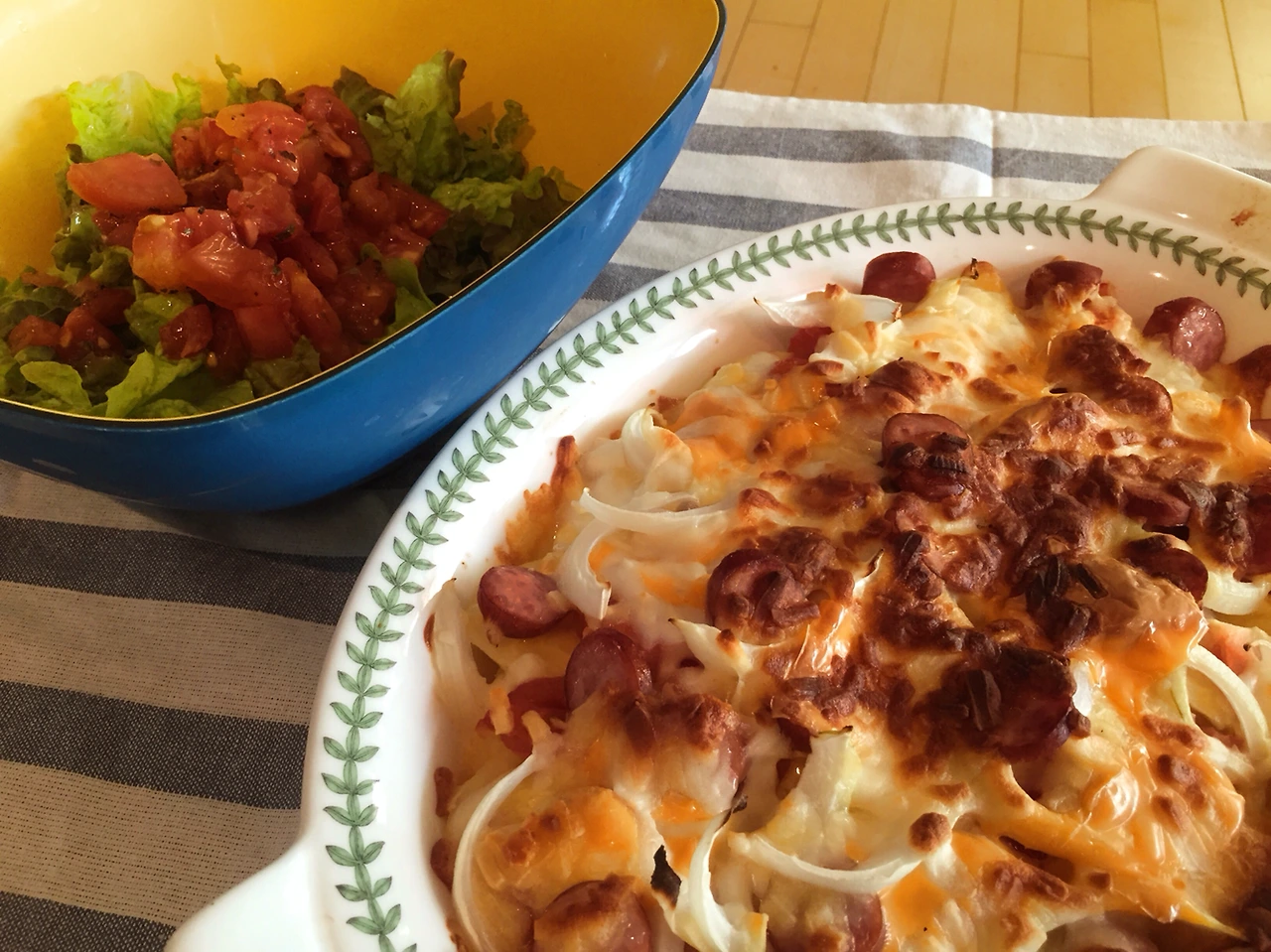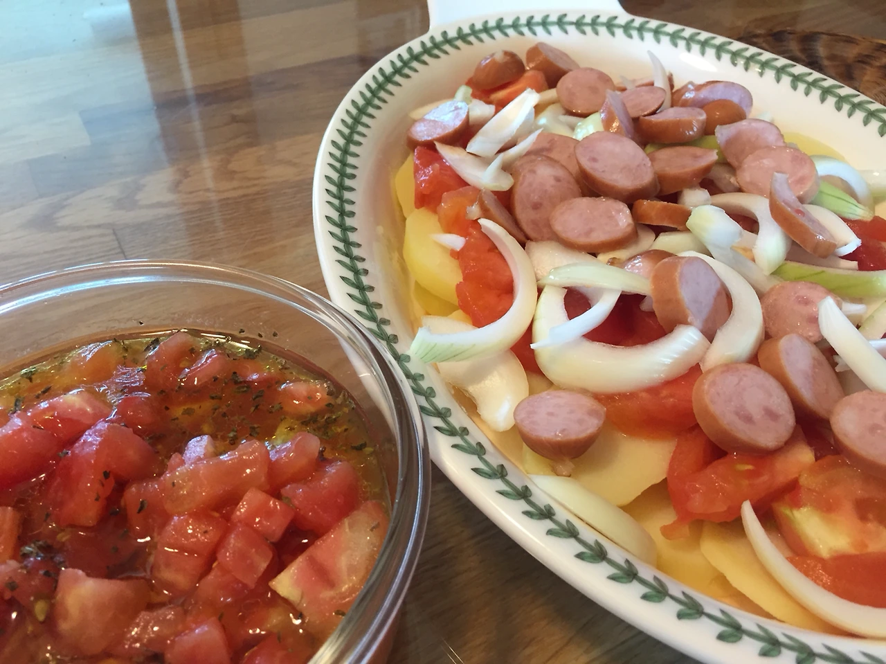 토마토 껍질 벗겨 오일 레몬즙 식초 설탕에 차게 한 샐러드. 익힌 감자 바닥에 깔고 토마토 양파 소세지 치즈 올린 그라탕. 어젯밤 와인과 허브에 재워둔 고기 예정대로 굽고. 토마토 덕에 서점 마실 포기하고 만찬