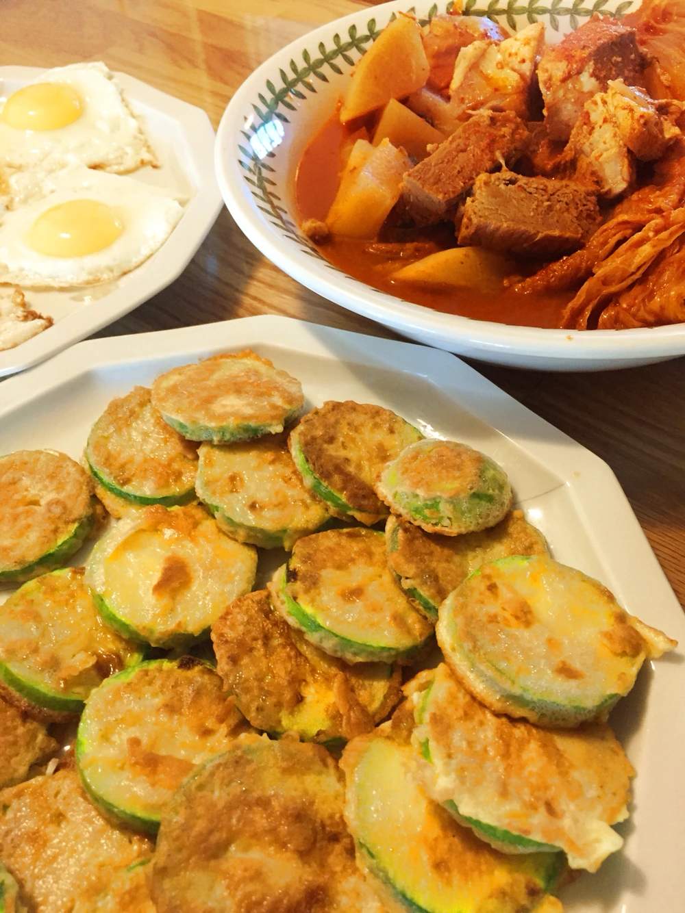 시엄니 김장김치도 이제 끝물. 돼지고기만 넉넉히 넣으면 거저 맛을 내던 김치찜도 아쉽겠네. 호박을 썰어 소금에 살짝 절였다가 밀가루 묻히고 계란물 입혀 전을 부치다니 간만 정성. 여름 야채인 호박을 즐겨주리라.