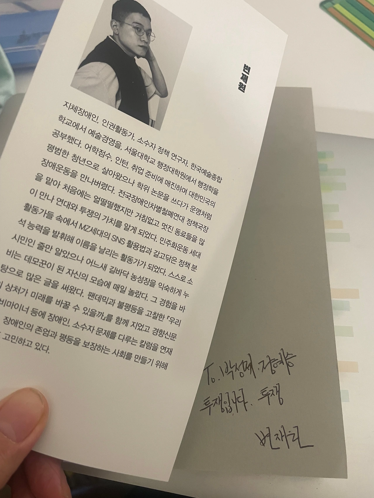 ‘지체장애인이자 인권활동가, 소수자 정책 연구자의 전국장애인차별철폐연대(전장연)에서 활동한 500여 일의 기록’. 책 설명이 묵직해서 각 잡고 읽었다. 그런데 첫 문장부터 예상을 벗어난다. 조금 말랑말랑한 느낌.