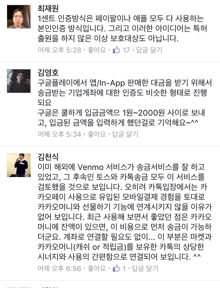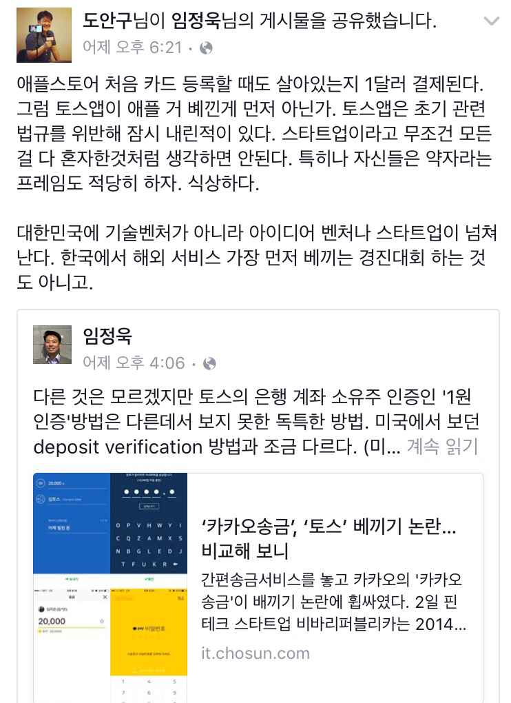 임정욱님이 토스와 카카오페이 논쟁에 정말 유사하냐고 글을 올렸고.. "아래 댓글에 다양한 의견이 있다"고 업데이트. 디테일한 논의들. 자정작용이 놀랐다. 도안구님은 "애플스토어 처음 카드 등록할 때도 살아있는지 1달러 결제된다. 그럼 토스앱이 애플 거 볘낀게 먼저 아닌가. 토스앱은 초기 관련 법규를 위반해 잠시 내린적이 있다. 스타트업이라고 무조건 모든걸 다 혼자한것처럼 생각하면 안된다. 특히나 자신들은 약자라는 프레임도 적당히 하자. 식상하다.