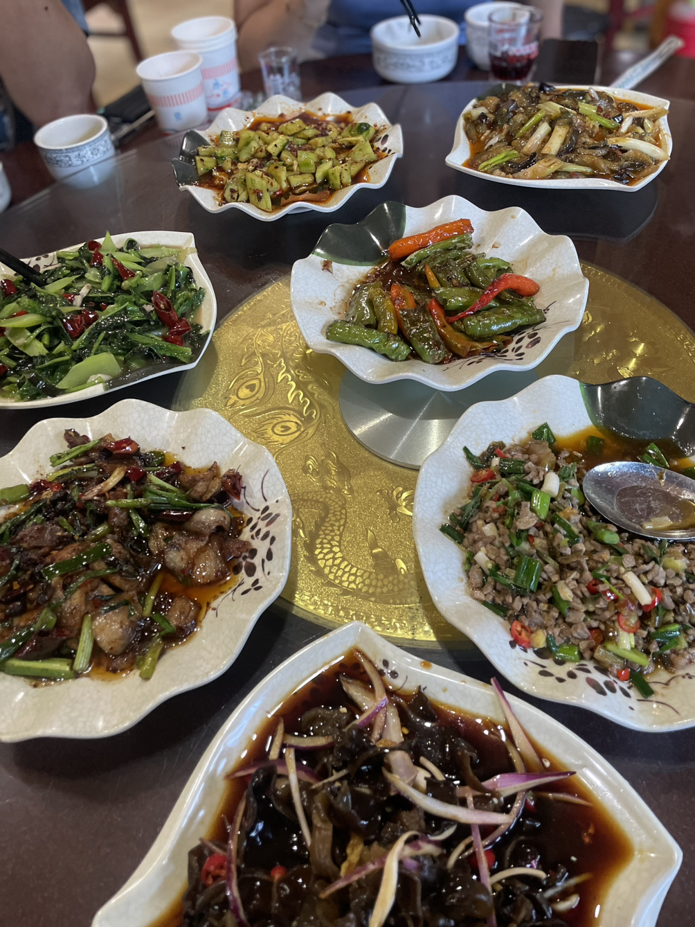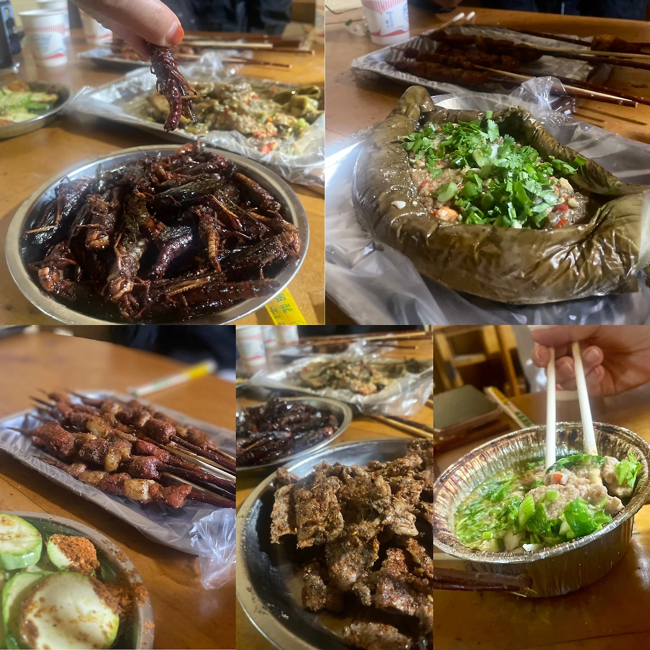 찬귀산의 점심도 저녁도 각종 볶음요리에 대만족. 양배추와 가지를 볶는 비법을 배우고 싶다. 향이 살아있는 버섯은 뭘해도 기막히다. 오늘은 저녁 2차로 온갖 꼬치구이를 맛봤다. 메뚜기 구이에 도전 못했지만, 돼지 뇌 요리는 맛을 확인했다. 곁들인 고수 맛만 났다ㅋㅋ