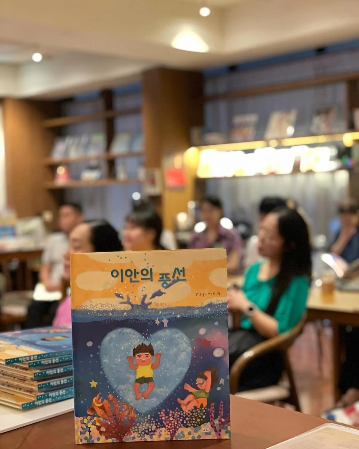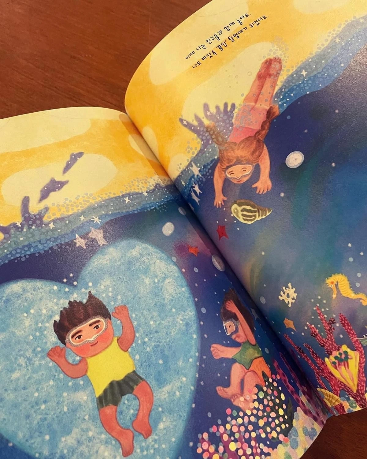 그런 이안은, 장기 기증으로 새 풍선을 얻고.. 친구들과 함께 놀게 됩니다. 이안도 바닷속 ’풍덩‘ 탐험대가 됐죠.. 바닷물은 반짝반짝 빛나고, 바닷속 세상은 영롱합니다. 작가님 말씀처럼 이안도, 그림도 사랑스럽습니다.