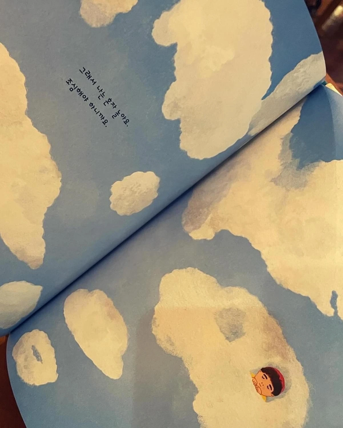 ===> 김리온 작가님이 아끼는 페이지. 몸이 약한 이안이가 다른 친구들과 함께 하지 못하고 혼자 노는데.. 파란 하늘에 구름 구름과 혼자 놀고 있어요. 이안의 마음이 구름 뒤로 숨어있는 거죠..
