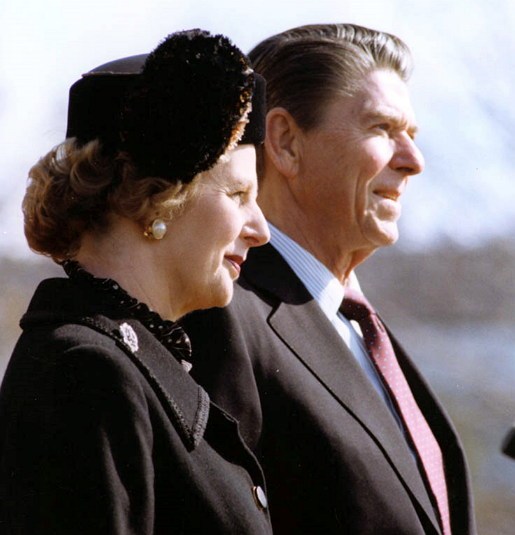 대처와 레이건 (1981). 대처리즘과 레이거노믹스를 상징하는 부자 감세와 낙수효과는 신자유주의를 상징하는 정책과 표어가 됐다.