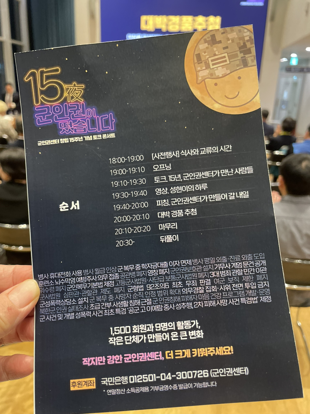 ‘15야, 군인권이 떴습니다’, 군인권센터 15주년 행사에 기꺼이 달려왔다. 윤일병 어머니 안미자님은 담담하게 말씀하는데, 나는 먹먹했다. 15년 군인권센터의 눈부신 성과는 누군가의 죽음을, 고통을 밝혀내는 과정에서 이뤄졌다. 귀빈석에 자리하신 분들이 저마다 사랑하는 이를 잃은 분들이란게 아득하다.
