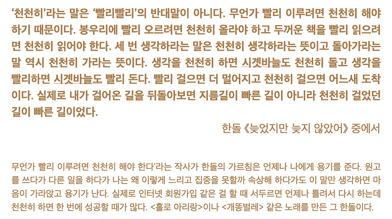 ’무언가 빨리 이루려면 천천히 해야 한다‘라는 작사가 한돌의 가르침은 언제나 나에게 용기를 준다. 원고를 쓰다가 다른 일을 하다가 나는 왜 이렇게 느리고 집중을 못할까 속상해 하다가도 이 말만 생각하면 마음이 가라앉고 용기가 난다. 실제로 인터넷 회원가입 같은 걸 할 때 서두르면 언제나 틀려서 다시 하는데 천천히 하면 한 번에 성공할 때가 많다. <홀로 아리랑>이나 <개똥벌레> 같은 노래를 만든 그 한돌이다.