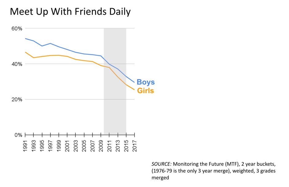 친구와 있어도 폰 ‘알림’이 울리면 대화가 중단된다. 친구는 알림보다 덜 중요한 존재다. 미국 10대는 깨어있는 동안 1시간에 평균 11개의 커뮤니케이션 알림을 받는다. 5분당 1개씩 알림이 온다. 게임이 우정에 도움이 된다고 얼핏 생각할 수 있겠지만 조사 결과, 미국의 12학년 남학생 중 외로움을 호소한 응답은 2000년 28%에서 2019년 35%로 늘었다. 친구가 한 명도 없다는 미국 남성은 1990년대 3%에서 2021년 15%로 늘었다. 2021년 ‘지난 6개월 사이 중요한 개인적 문제로 대화를 나눈 사람이 있느냐는 질문에 젊은 남성 28%가 없다고 답했다.