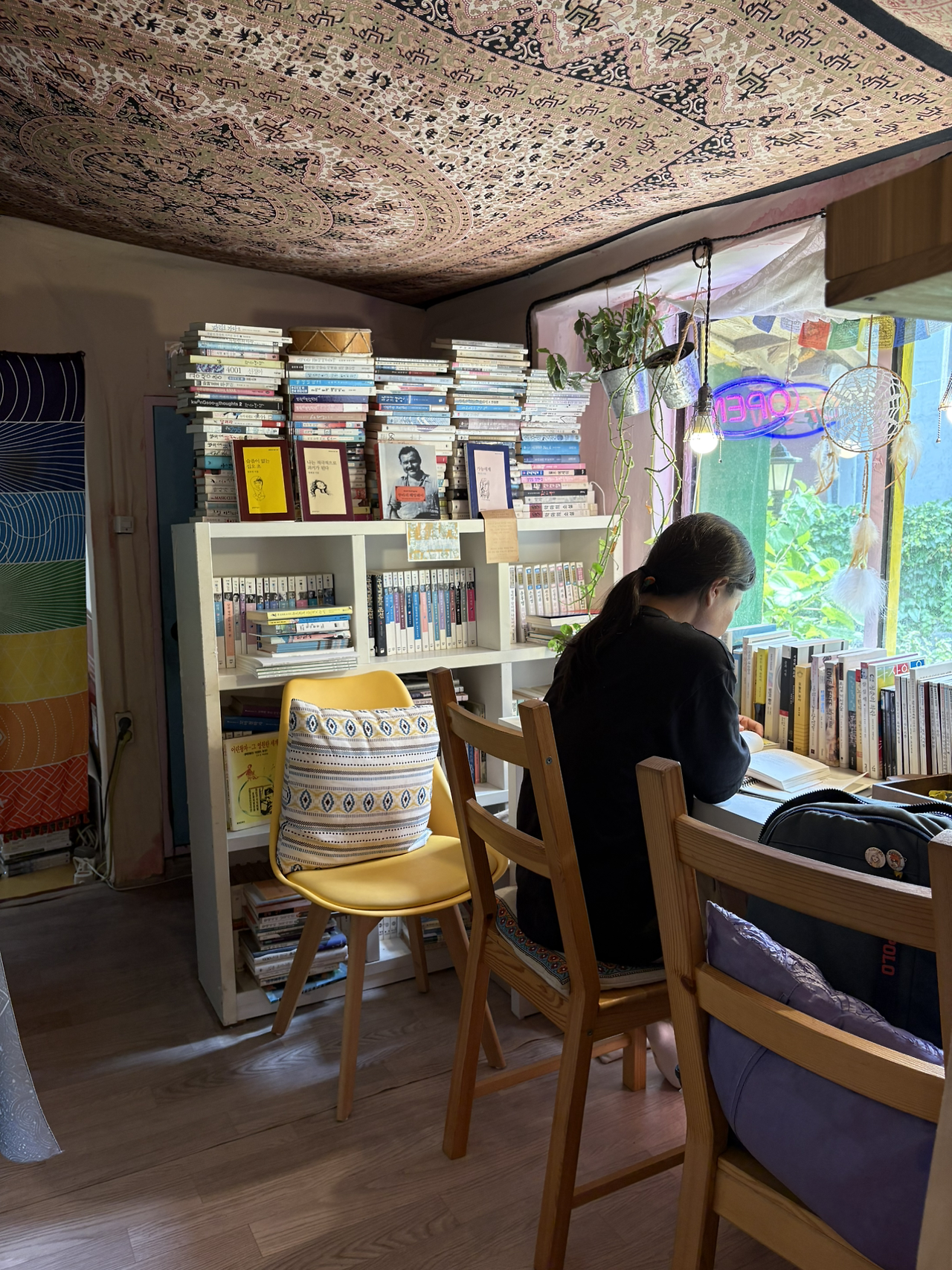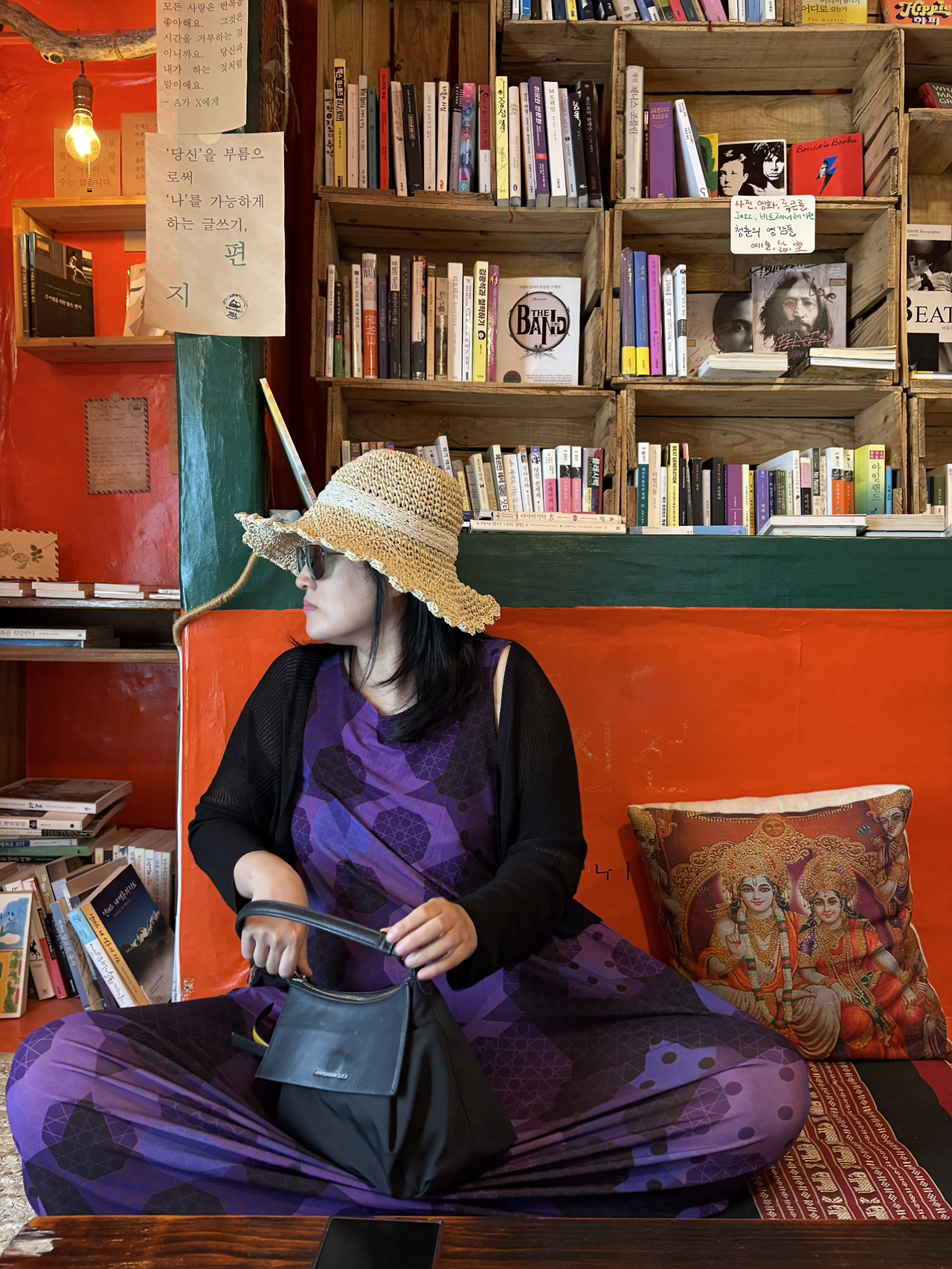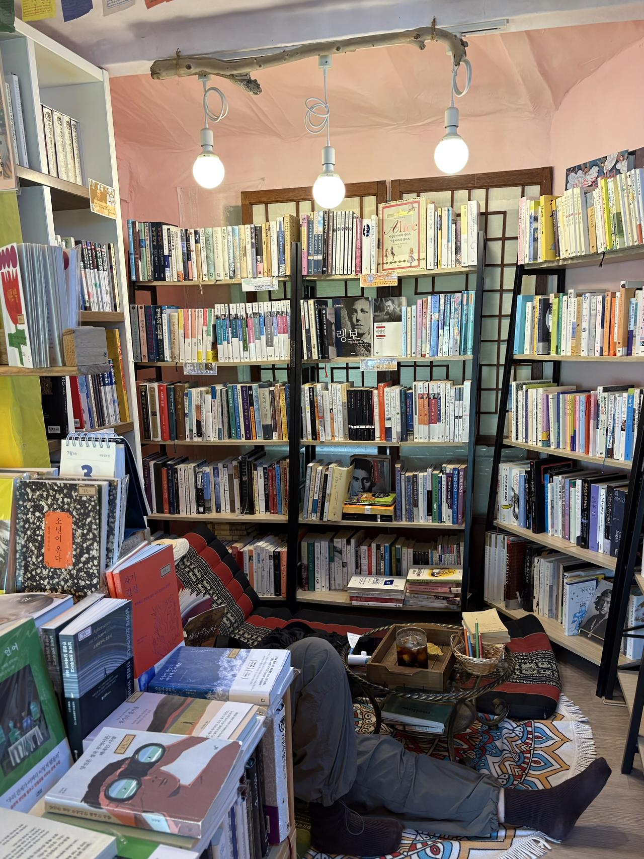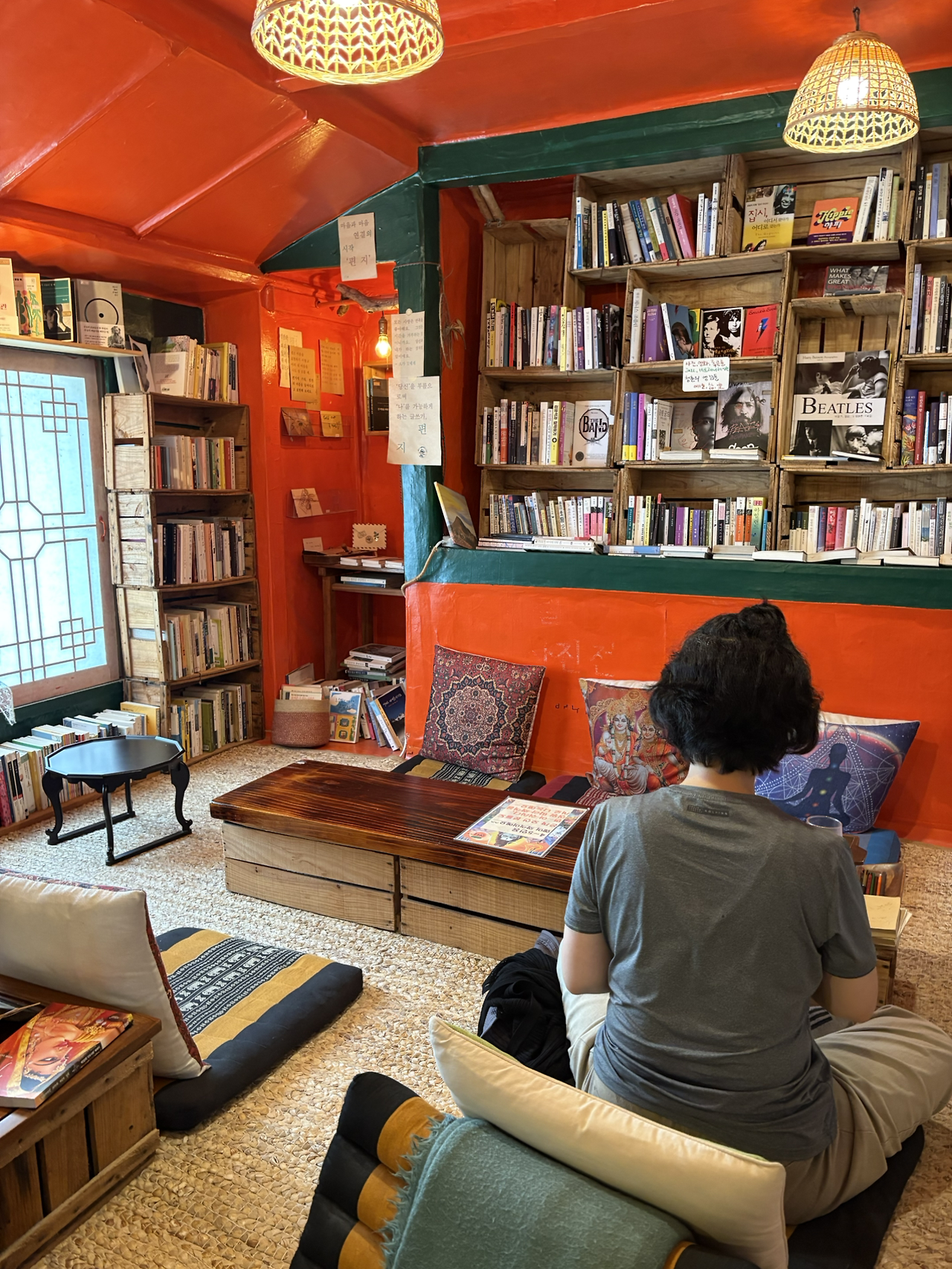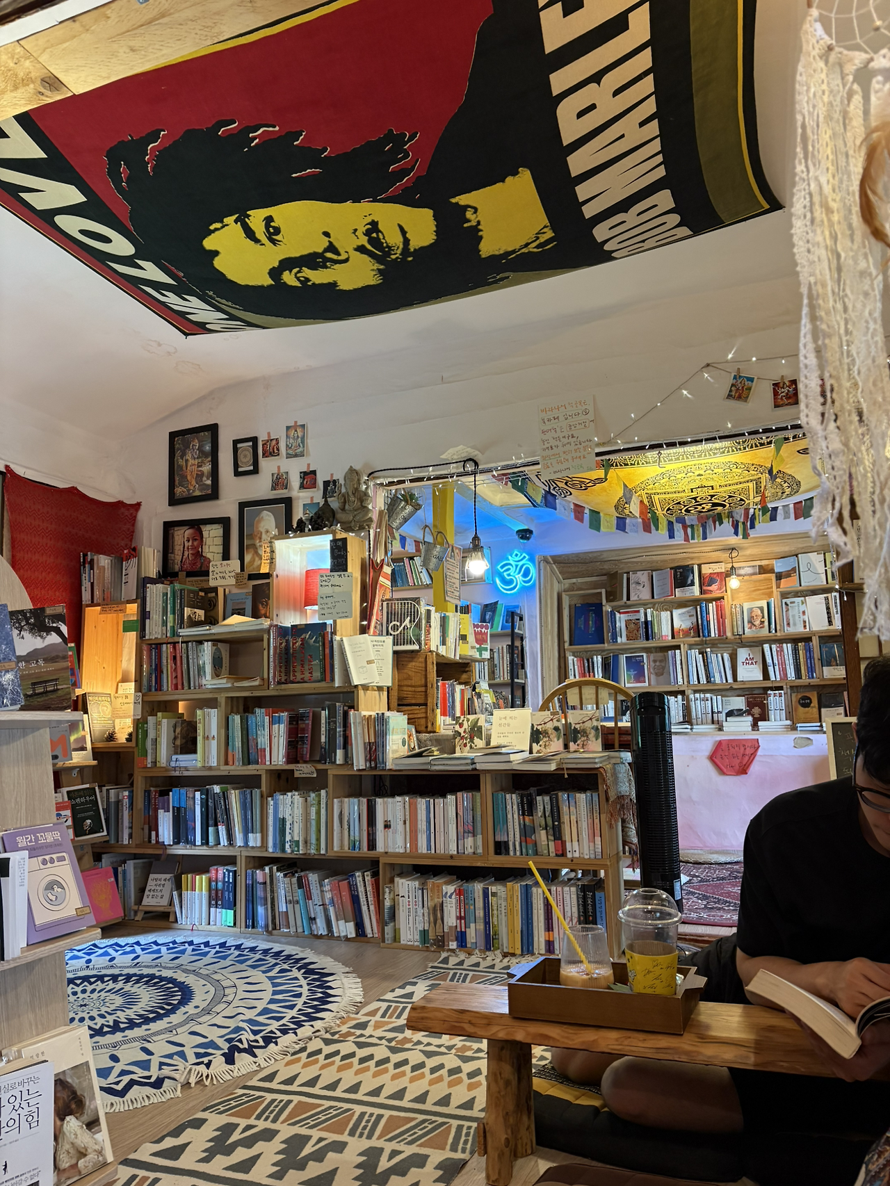제주시 북쪽 바닷가 횟집 거리에 마치 낯선 별에 떨어진 우주선 같은 공간 #바라나시책골목. 구석구석 숨어서, 널부러져서 책보는 분들 있음. 여행, 음악, 철학 신간들 눈에 띄고.. 천정에 체 게바라까지 뭔가 귀여운 혼종. 내년엔 조천으로 이사가신다고.
