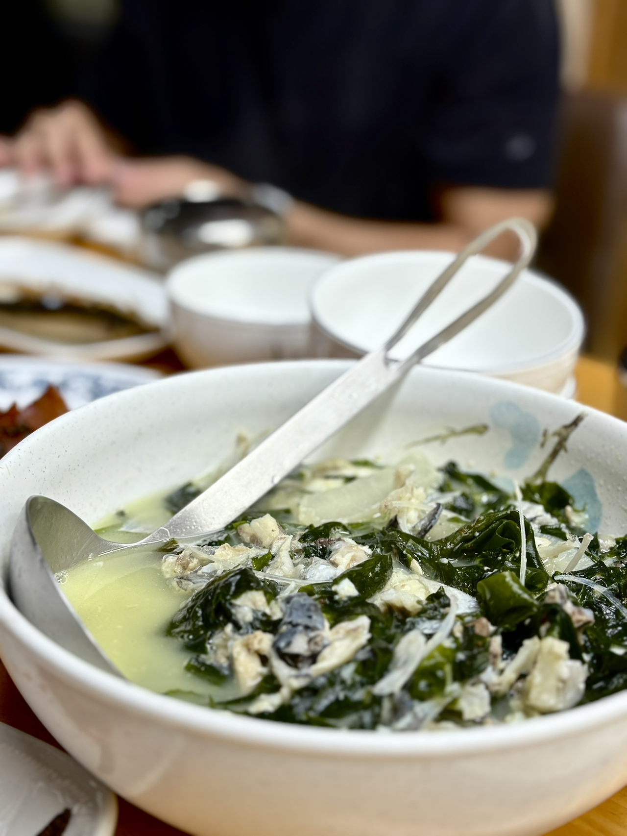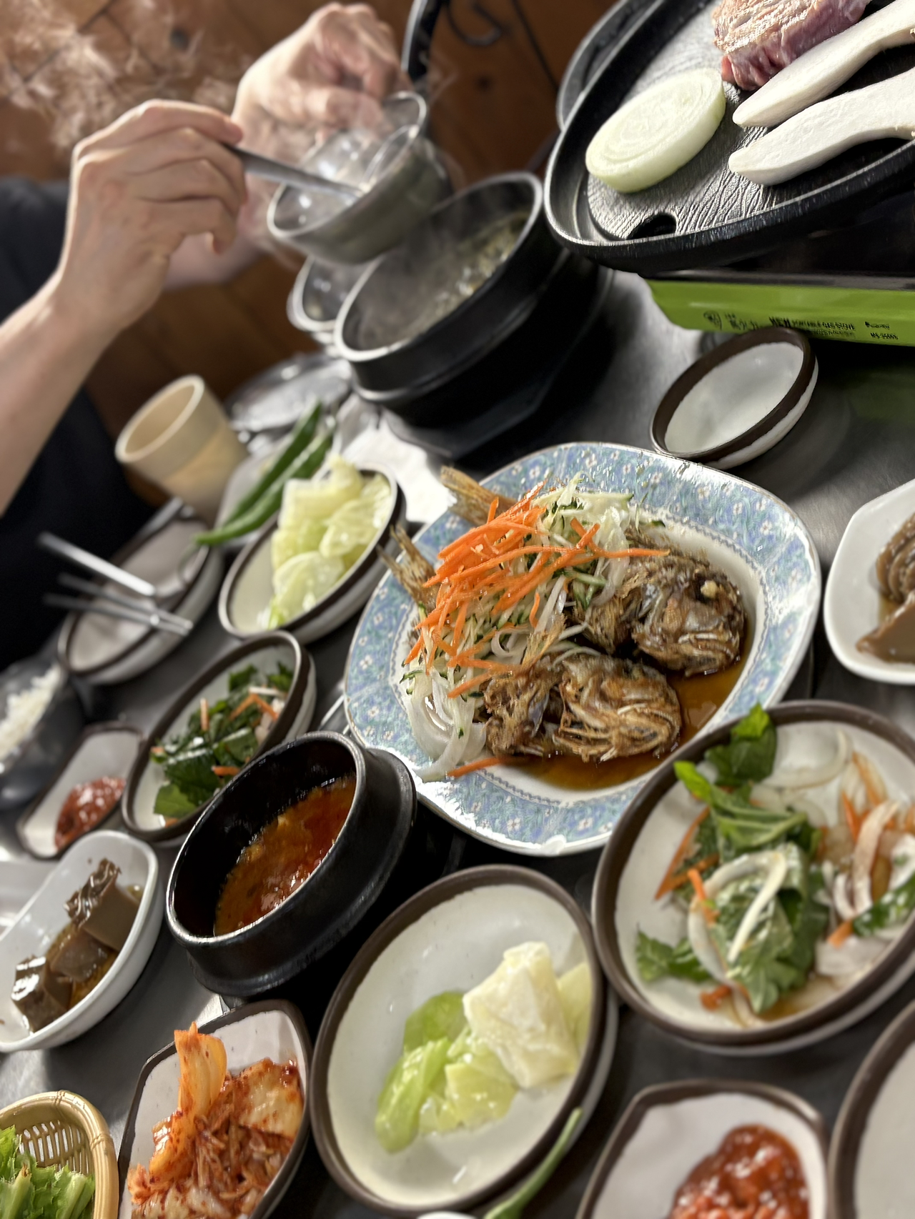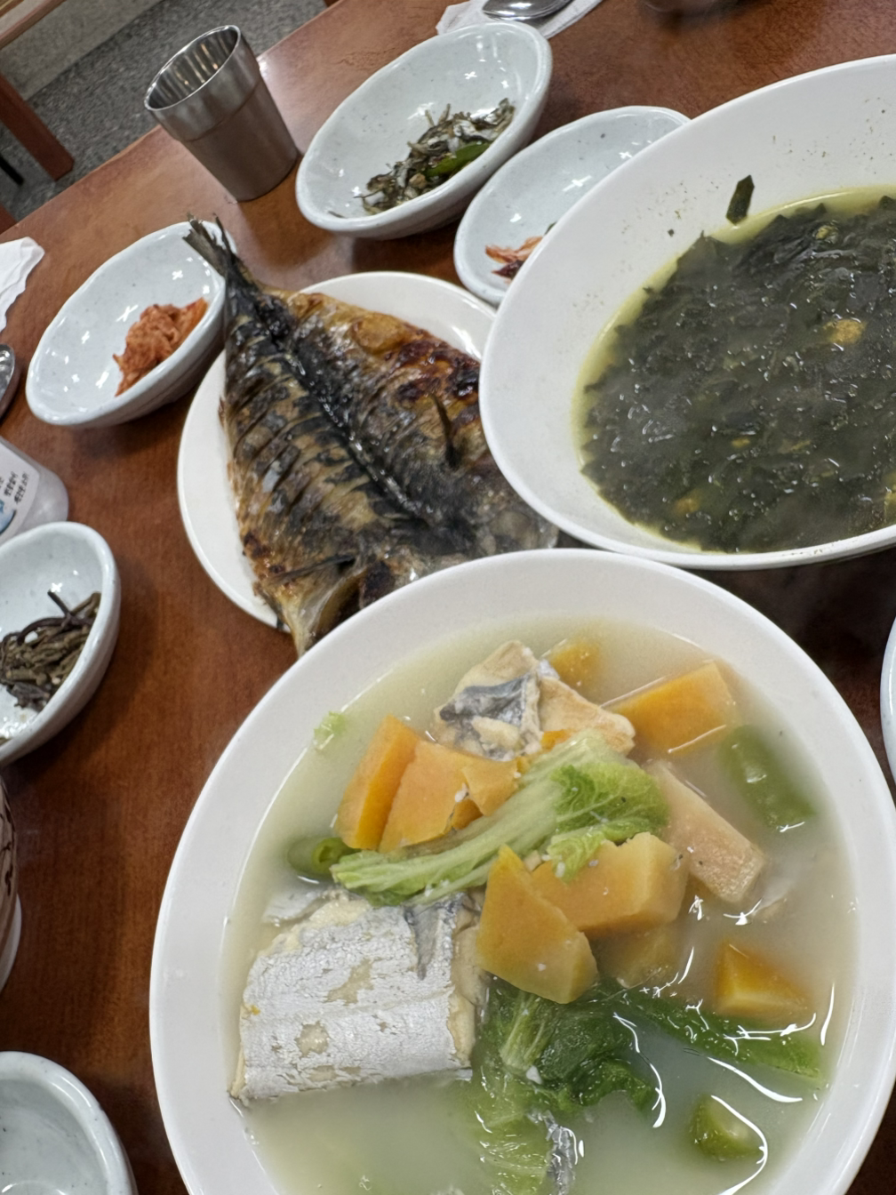 서점 지도 보면 욕심나지만 이쯤하고 산방산으로 고잉홈. 제주 근무중인 H님이 강추했다는 #춘미향식당 오늘의 하이라이트다. 돼지목살 90g, 전복성게미역국, 옥돔튀김, 멜조림 정식 2.2만원. 정식 2인분에 갈치조림 소짜(4만원)면 4인 행복한 과식. 고기 퀄도 고퀄, 멜조림과 갈치조림은 살짝 달지만 숟가락 뗄 수 없는 맛. 옥돔 통구이 훌륭하고 바로 부쳐주는 밑반찬 전조차 남기기 싫은 밥상이다.
