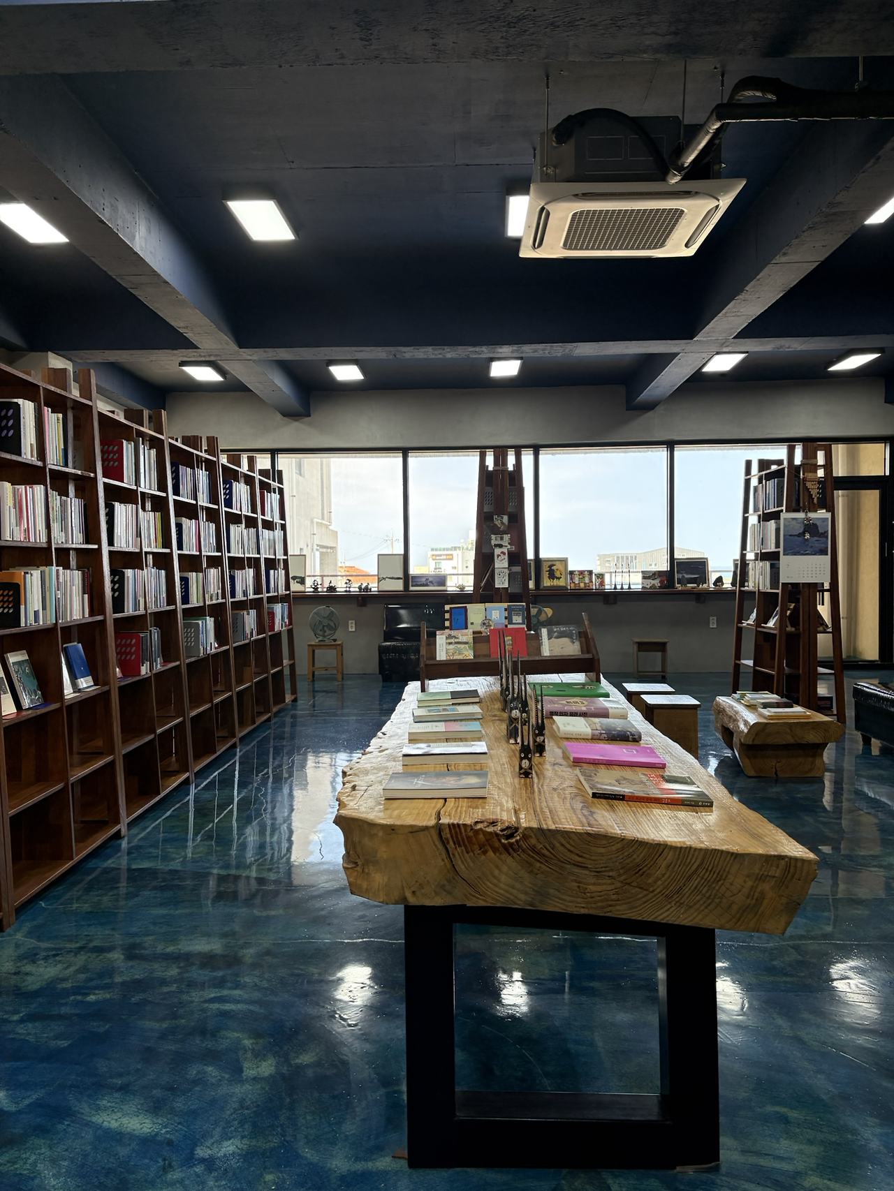 월정리 안쪽 #책방오후, 높은 서가에 나름 쥔장 취향 보이는 큐레이션.