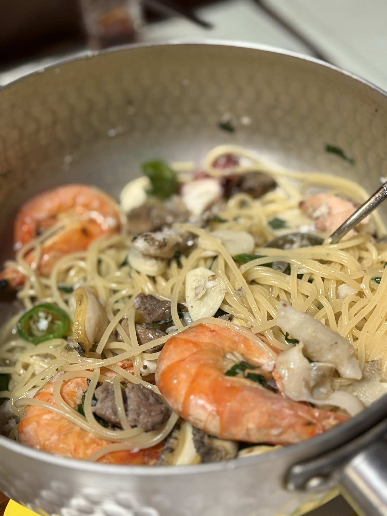 한밤의 해장 파스타. 저녁 식당에서 먹고 남은거 다 싸들고 온 보람…