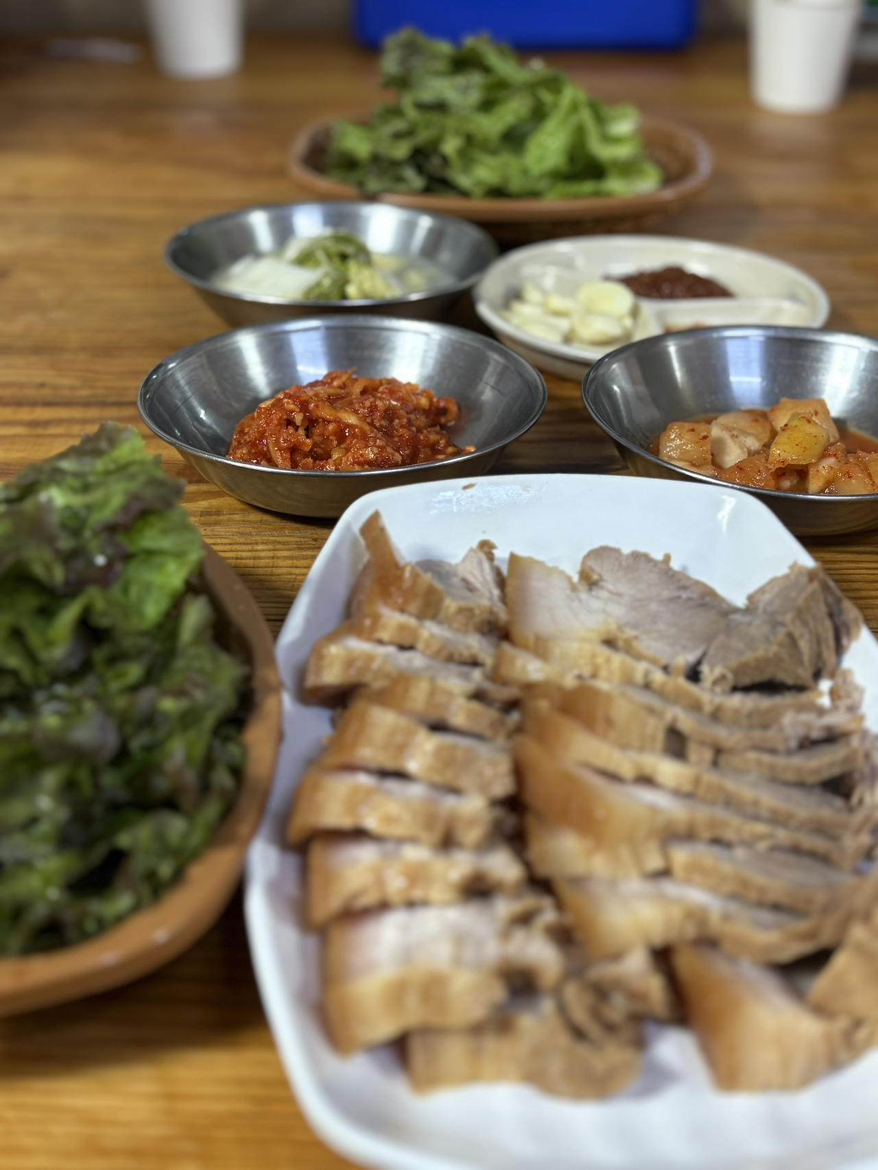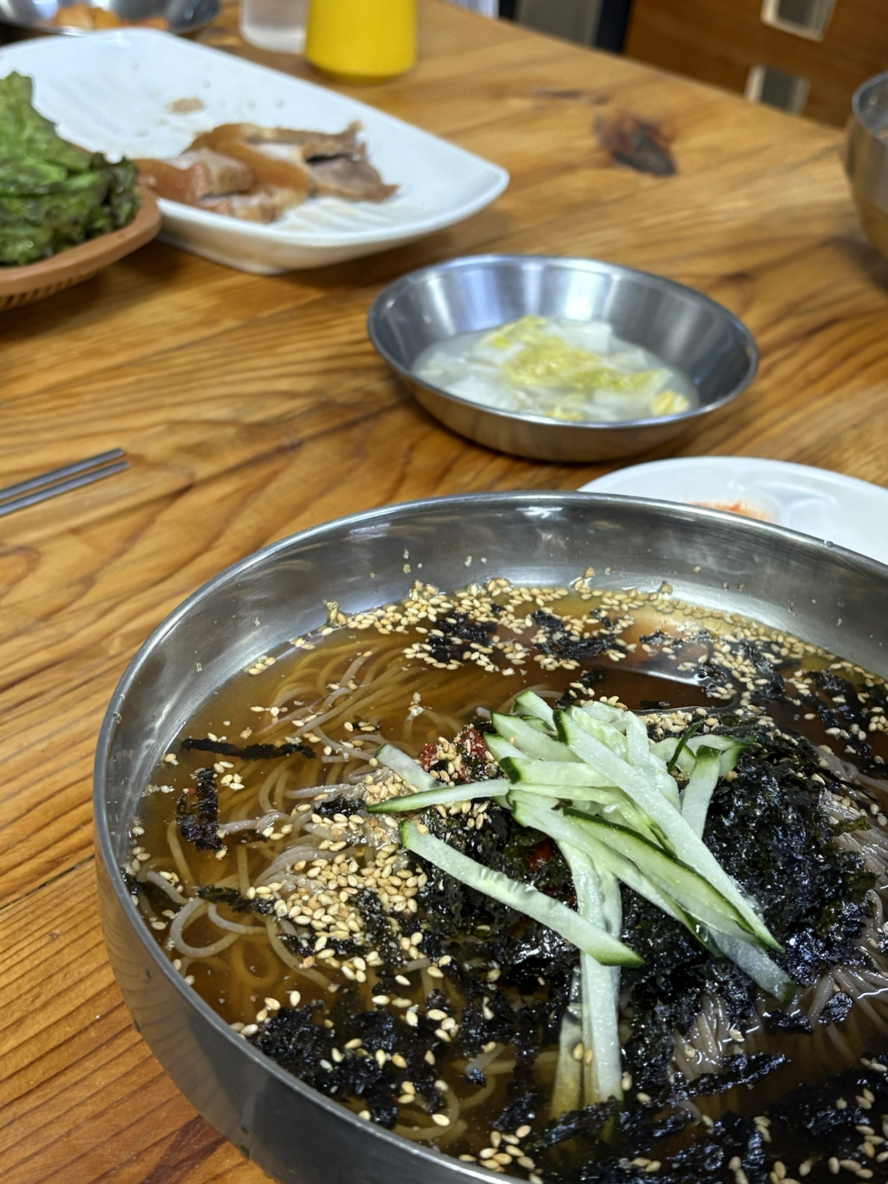 진부역 부근 유명막국수. 수육 소짜(2만) 넉넉한데다 살살 녹는 맛. 물막국수(8000)는 배불러도 다 들어가는 맛이라 하자.