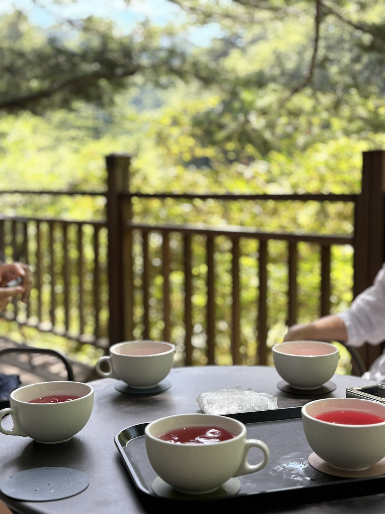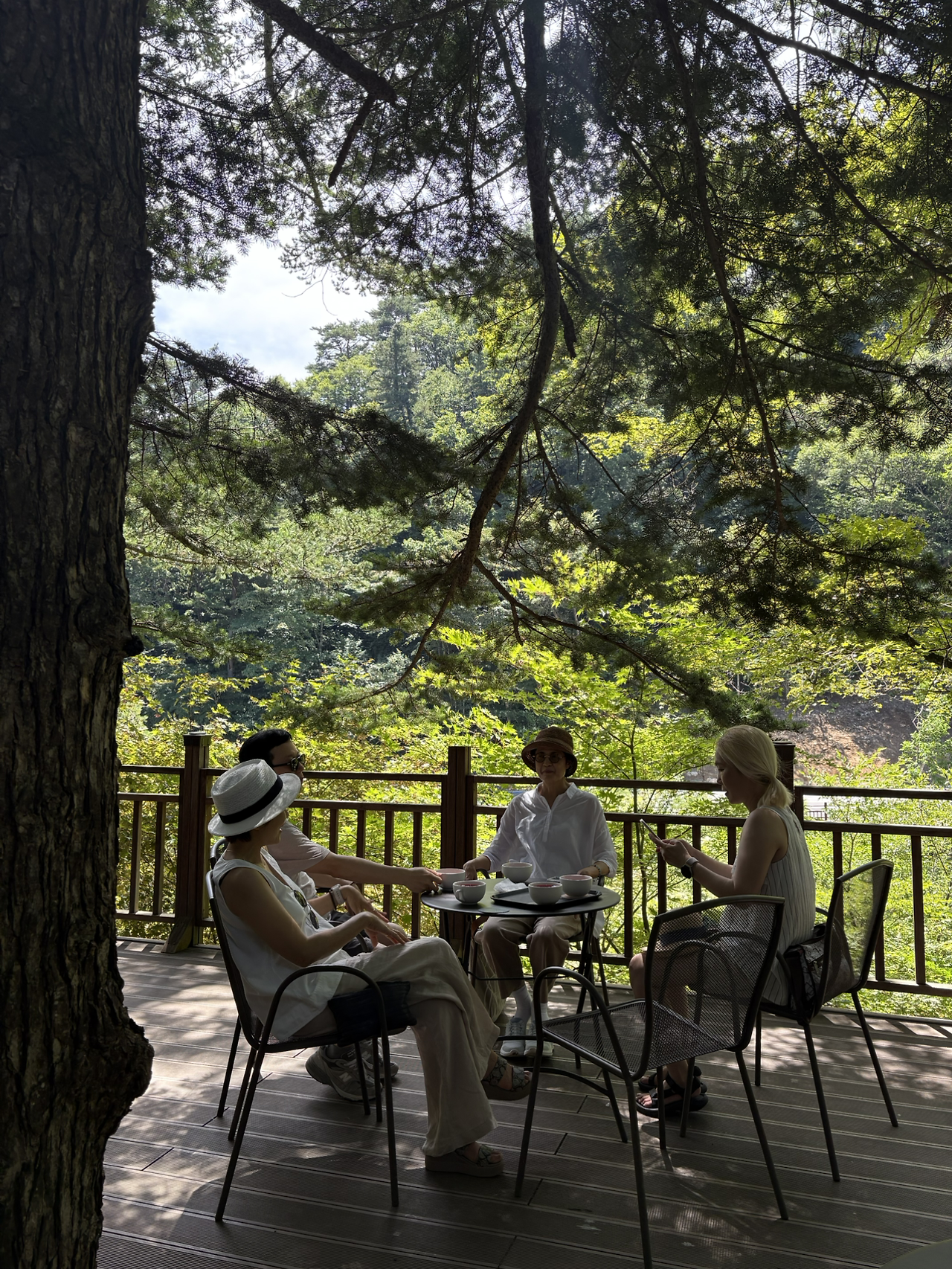 월정사에 도착하면 차가운 오미자차로 한숨 돌린다. 에어컨 바람 대신 테라스 나무 그늘 아래 바람이 좋다. 전날 먼저 도착한 일행 말로는 밤에 18도 날씨 라는 대관령. 낮에도 그늘은 별로 덥지 않다. 이것이 피서.