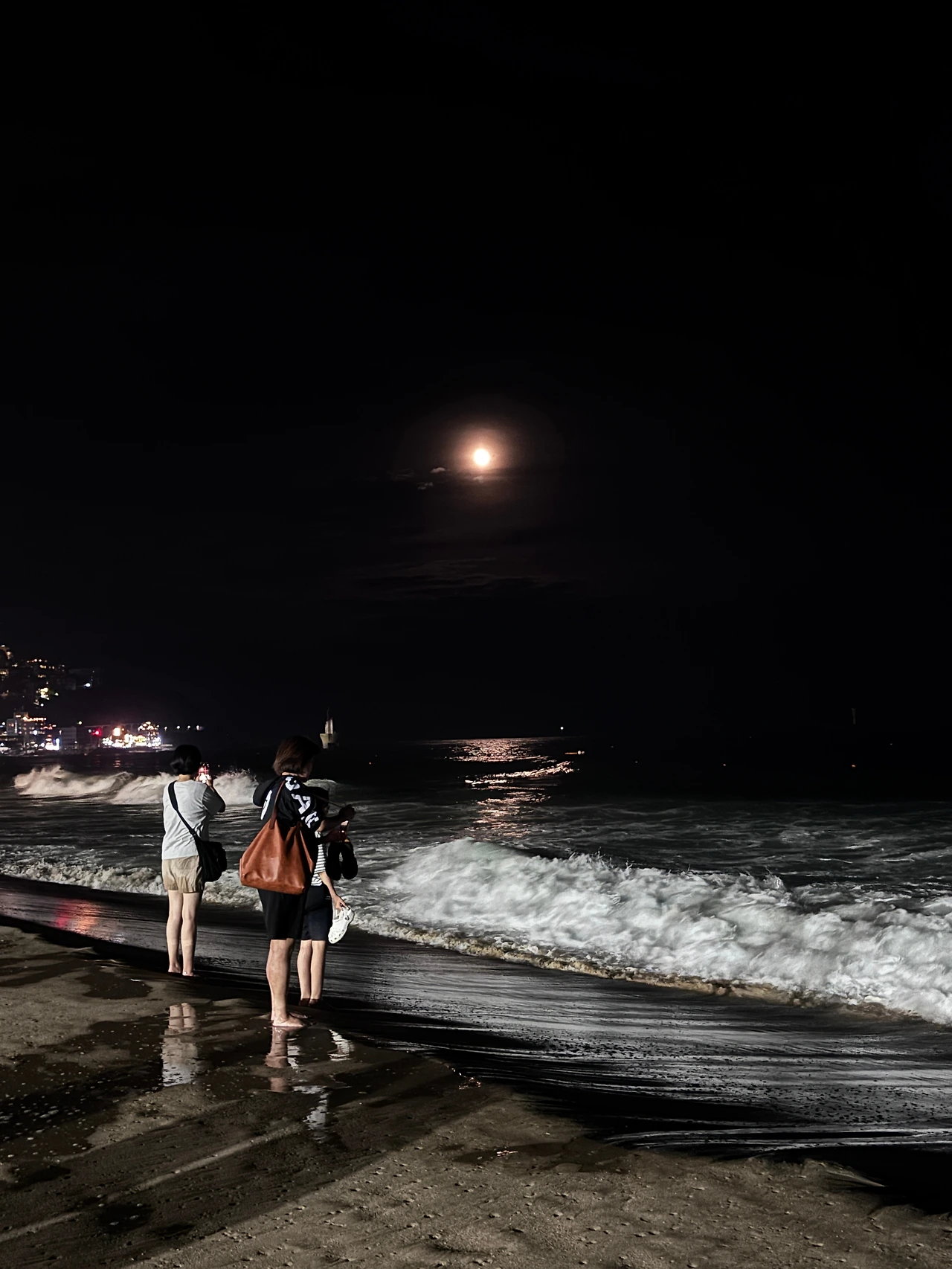 밤바다는 더 환상적이었다. 노랗게 빛나는 달이 구름 밖으로 나왔다. 달님에게 간절히 기원하는 내 맘이 말이지.. 무튼 파도랑 놀면서 걸었다. 좀 많이 먹었거든..