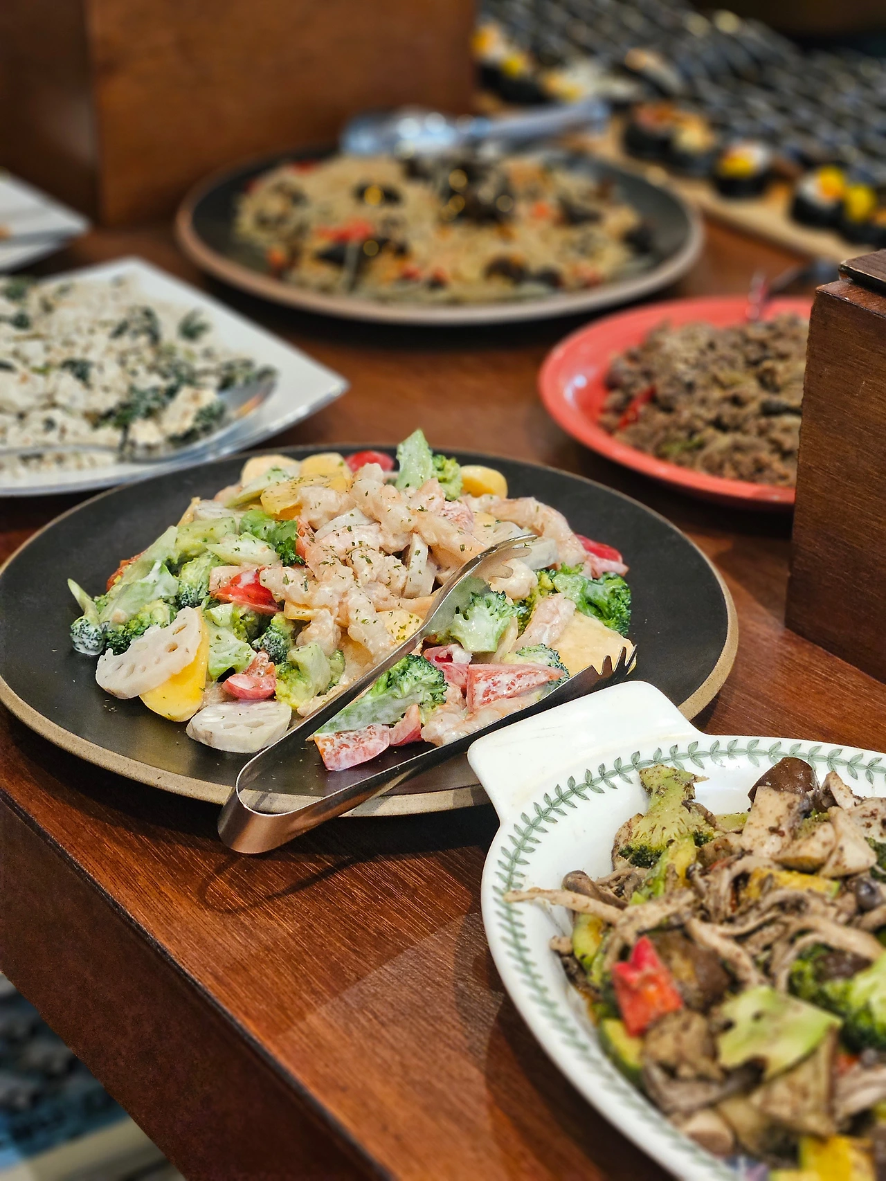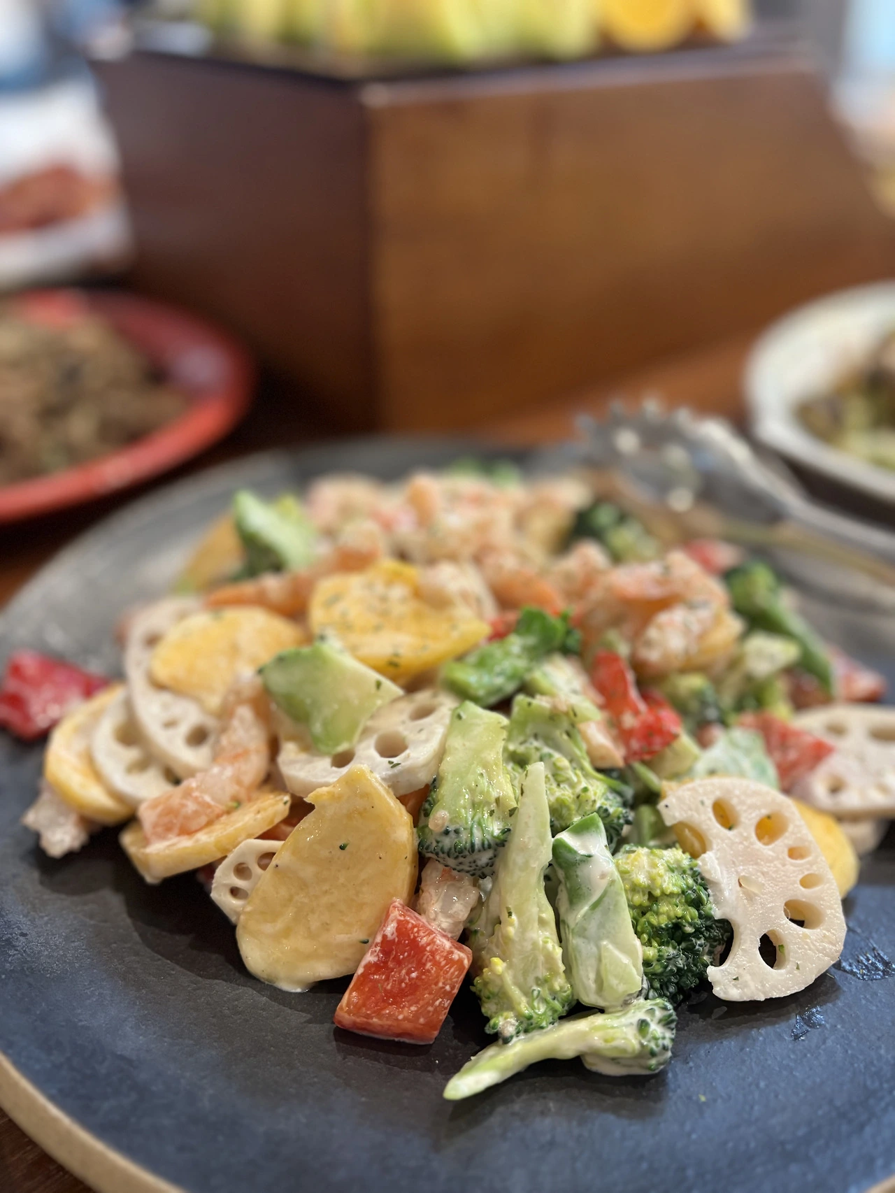 연근과 새우, 브로콜리를 데치고 파프리카, 감을 더해 준비. 차게 두었다가 먹기 직전 참깨드레싱, 마요네즈로 쓱쓱 버무리면 끝. 엄마가 하던 잣소스 떠올랐지만 40인분 준비하면서 그렇게까지 할 여력은 없..