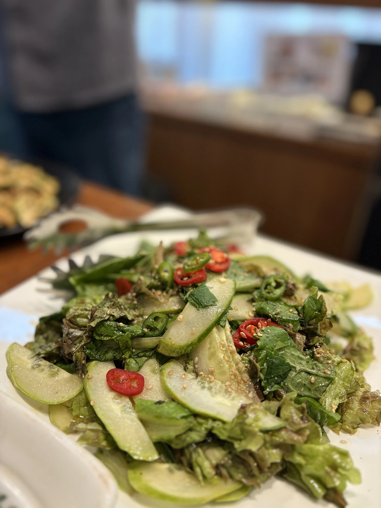 9시 행사 시작 후 상추 오이 깻잎을 씻어 막판에 간장식초설탕참기름에 무쳐서 냈다. 이게 가장 먼저 떨어짐.