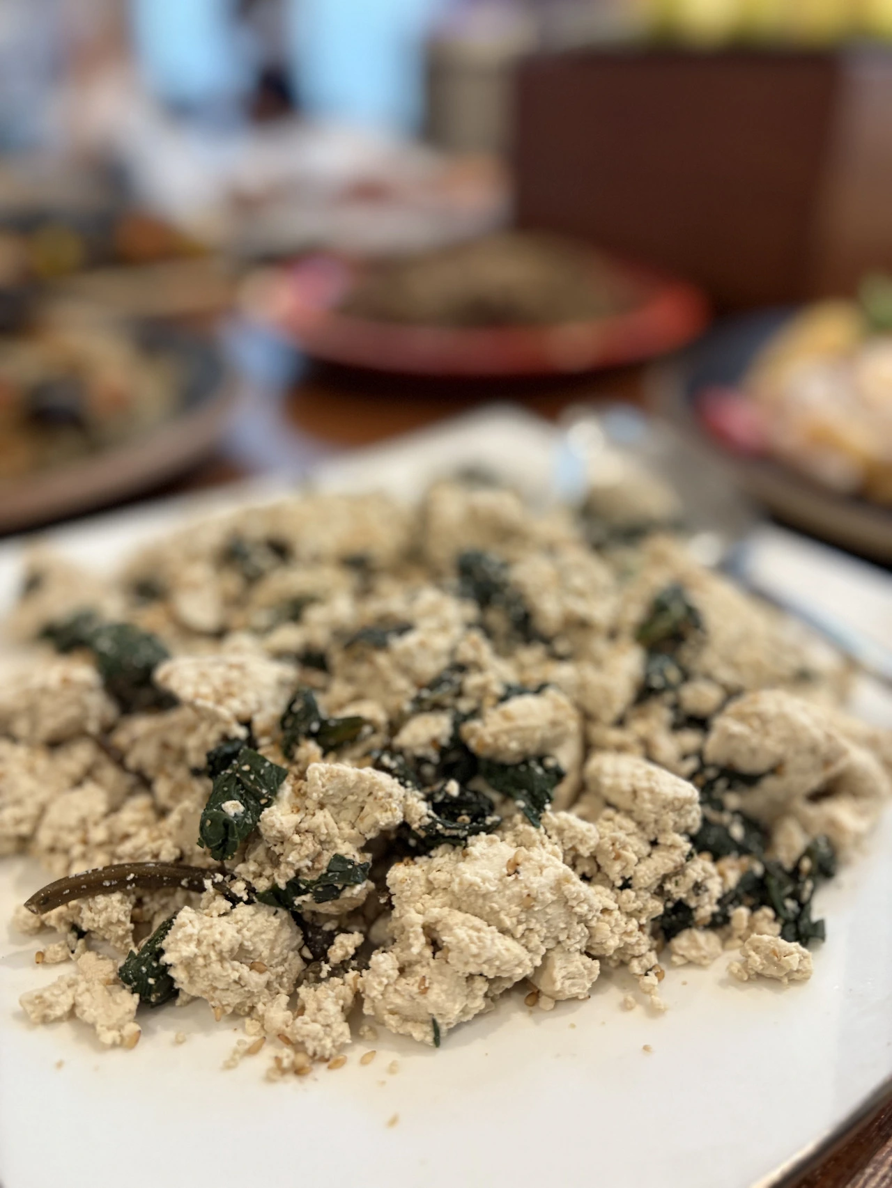 비건의 단골 재료인 두부는 뭘할까 고민하다가 물기 쫙 빼고 간장쯔유참기름으로 간하고, 액젓 매실청으로 무친 바라깻잎 나물을 쫑쫑 썰어 섞었다.
