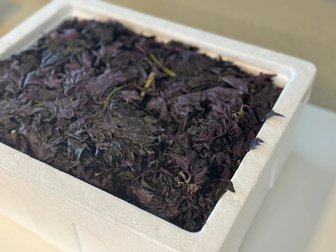 2) 잘 절여진 매실과 자소엽을 층층히 쌓고 마지막에는 자소엽으로 덮어주기