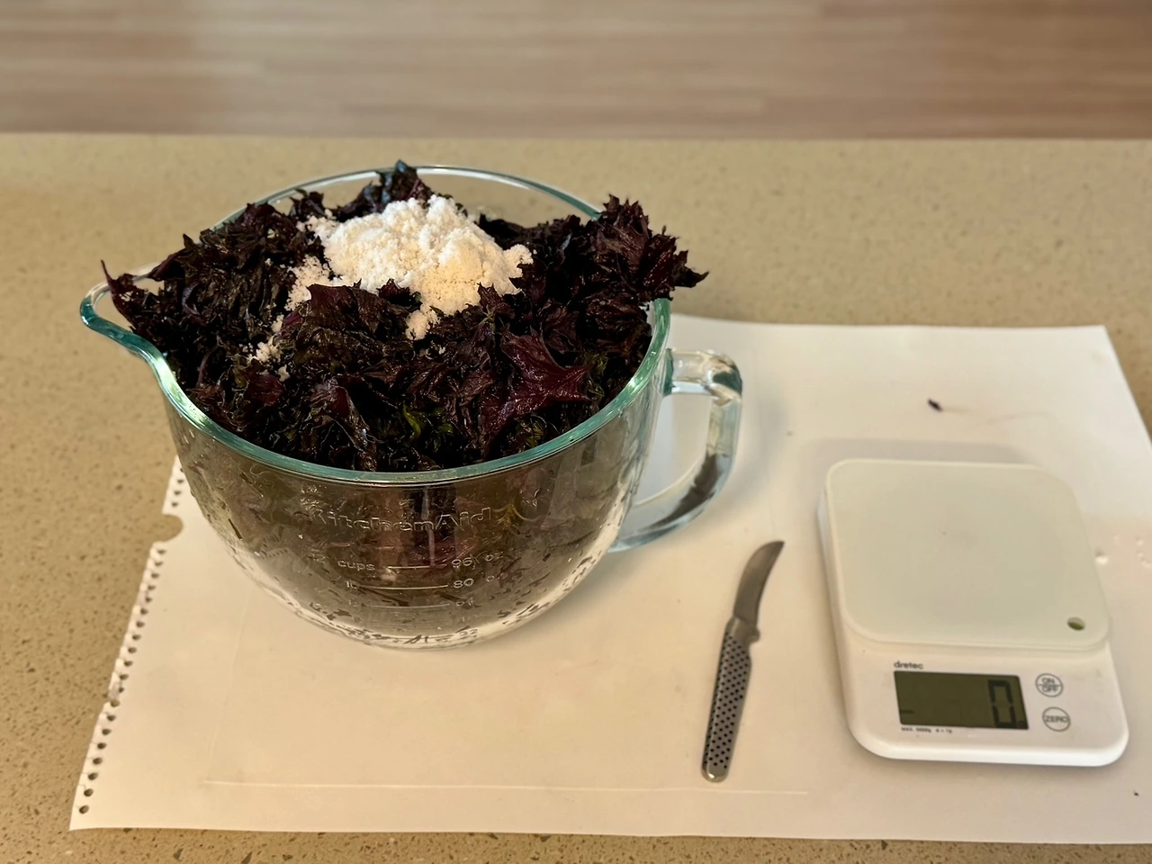 2) 500g 기준 100g(20%) 소금을 넣고 절여요.
