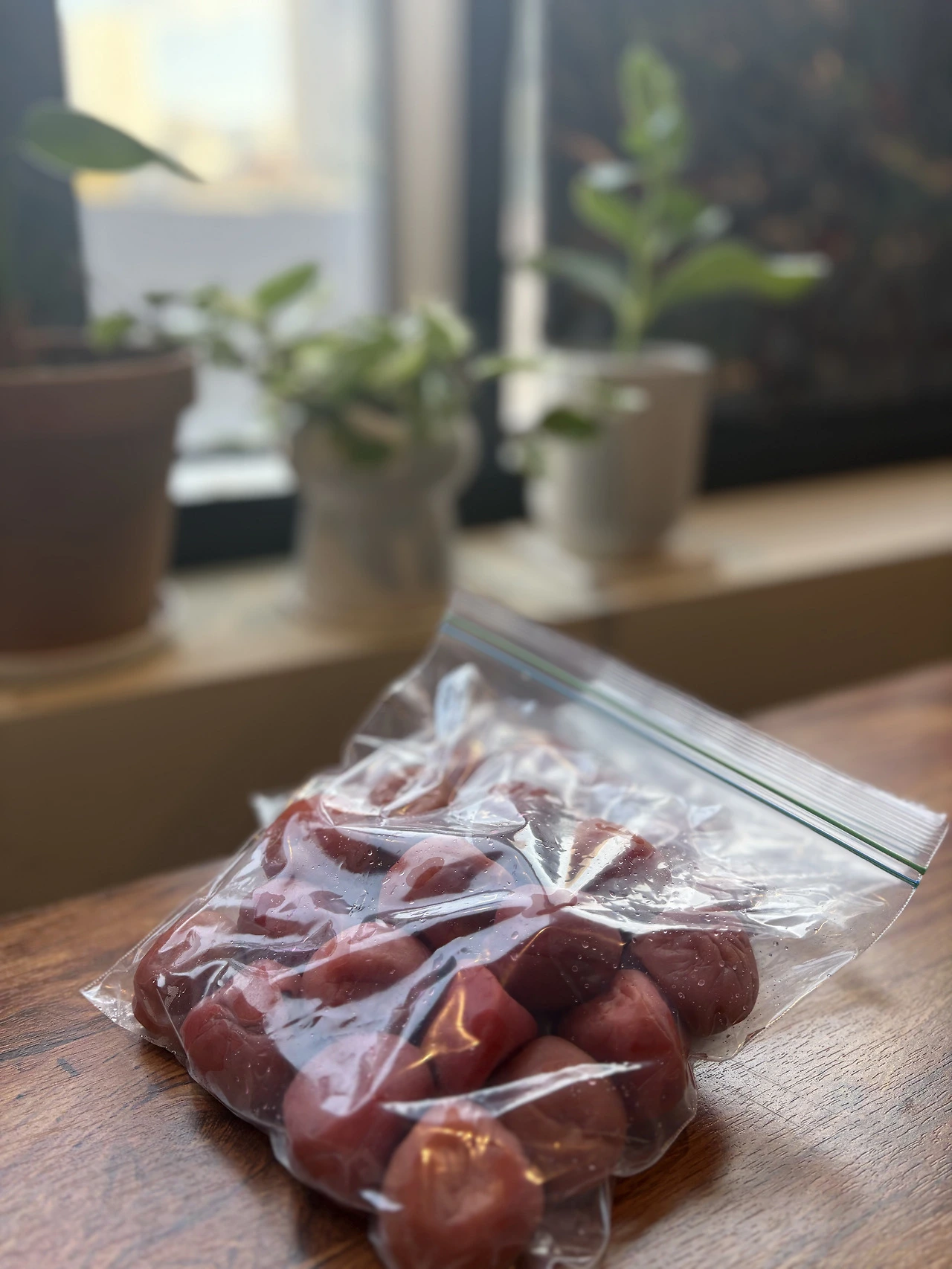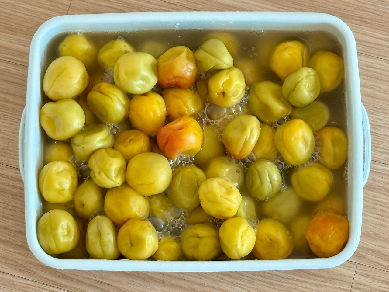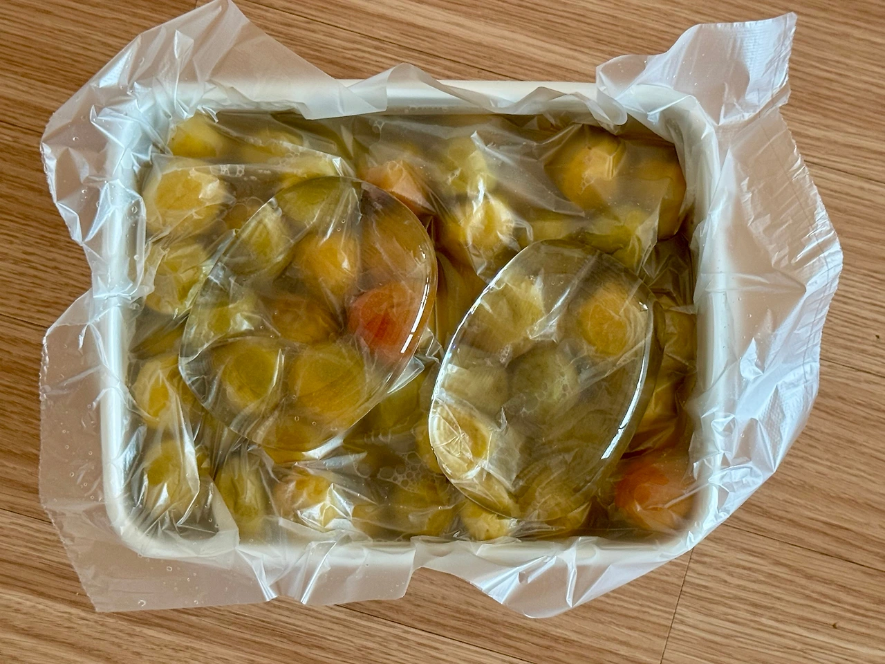 “소금에 절이고 3일이 지나면 매실물이 나와서 찰랑거려요. 매실이 쪼그라들며 통 안에 공간이 생기기 시작합니다. 균 발생을 억제하기 위해 공기 접촉을 줄여줄 누름돌을 올려요. 누름돌은 부피고 크고 보관이 귀찮아서 저는 물을 이용합니다. 지퍼백에 물을 1/5-1/4 정도 넣고 공기를 빼줍니다. 지퍼백의 물이 나오면 곤란하니 소독한 위생봉투로 한번 더 감싸줘요.