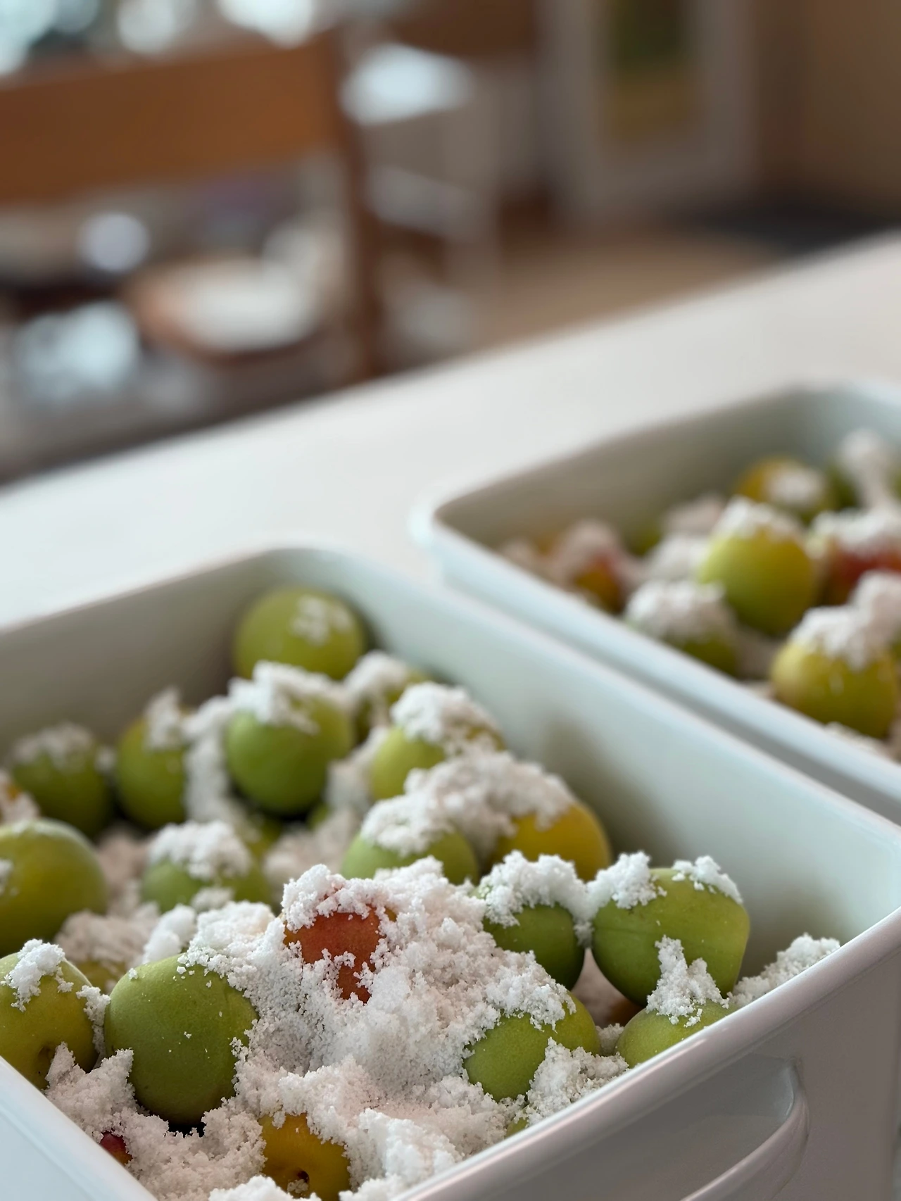 큰통을 소독하듯 소주로 닦고, 깨끗이 씻은 매실 하나하나 소주로 또 닦으며 미세 꼭지 다 따내는 작업. 소금을 덮은 매실이 영롱했다.