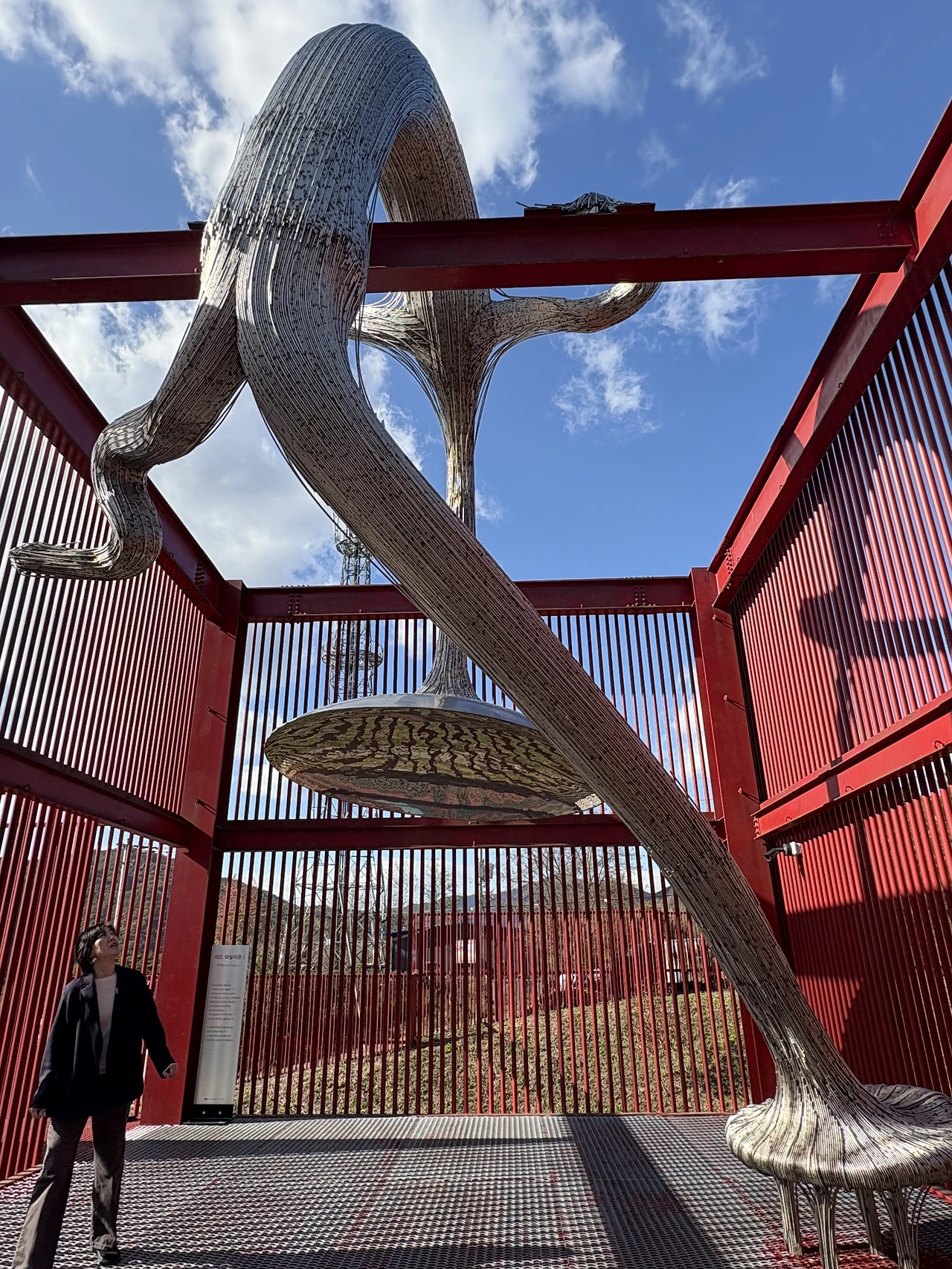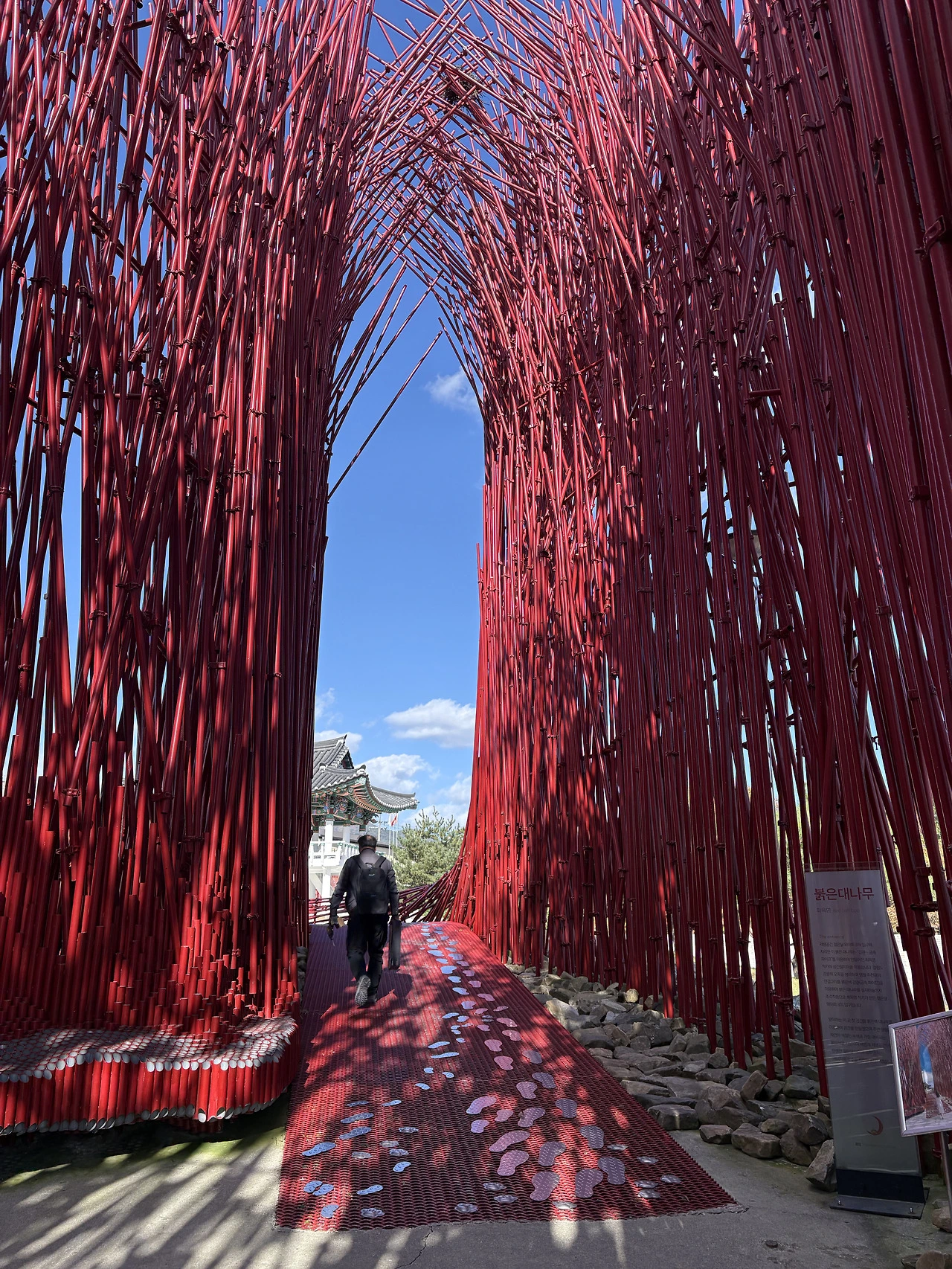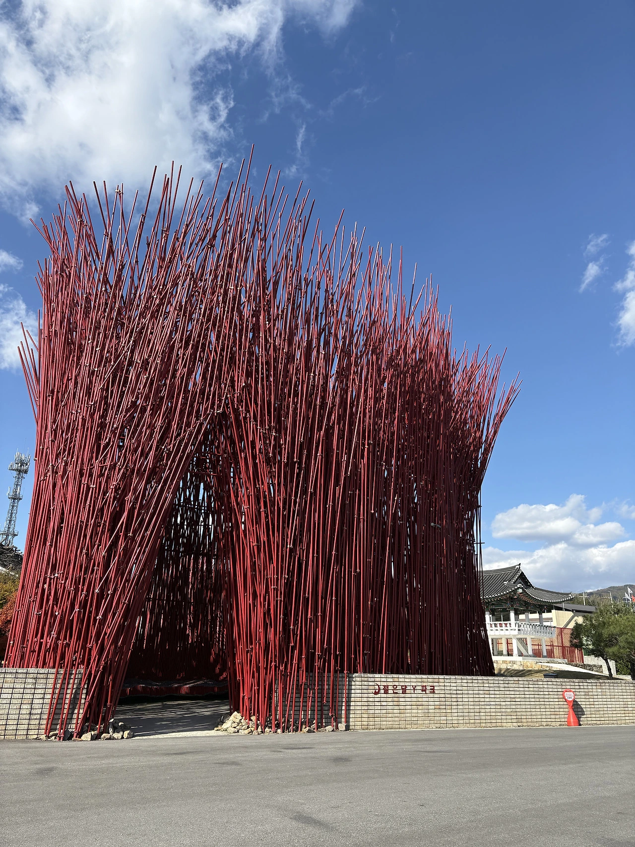 오늘의 경이로운 발견은 젊은달(영월) 와이파크. 공간디자이너 최옥영 쌤의 작품들이 펼쳐지는 8000평 공간이 거대한 캔버스다. 들어가는 입구부터 붉은 파이프가 마치 대나무숲처럼 인상적이다. 파이프 숲 너머 하늘은 청명하게 빛나는 곳은 사진 명소. 이곳은 곳곳이 인스타그래머블하다.