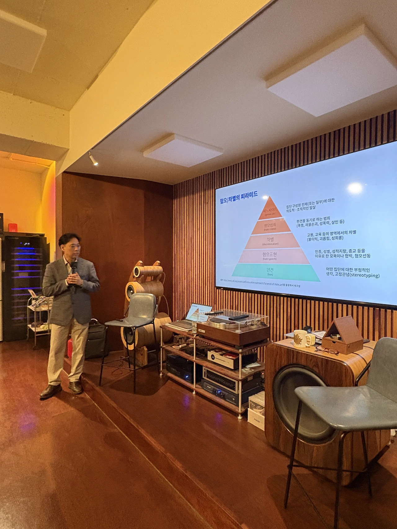 『차별하지 않는다는 착각』 북토크에서 홍성수 숙명여대 교수님은 혐오의 차별의 피라미드부터 소개하셨습니다. 북토크가 열린 8일 오티움은 간만 후끈하고 진지했습니다. 노키즈존에 이어 노차이니즈존까지 등장한 시절입니다.