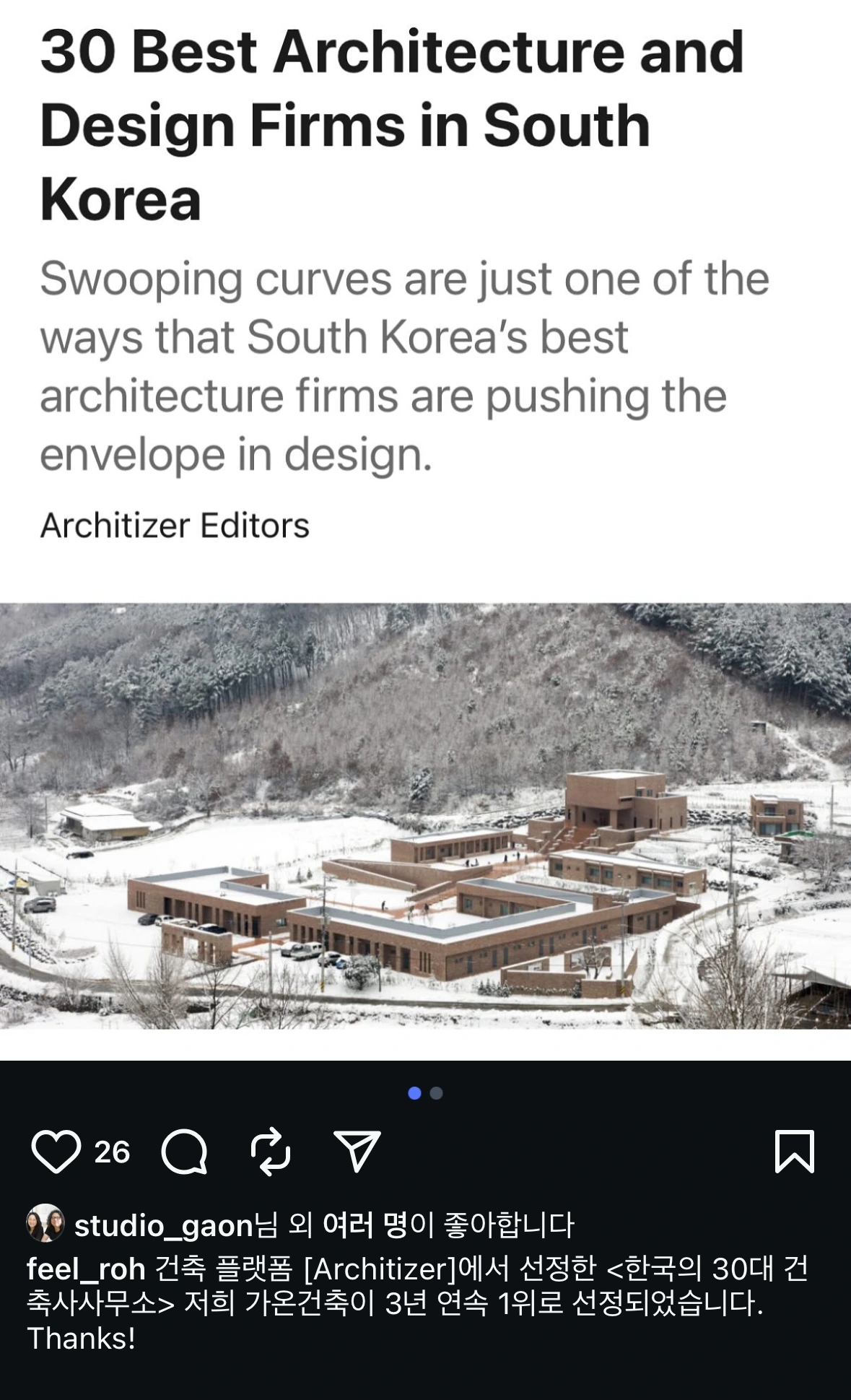 아참. 두분 건축사무소 가온이 한국의 30대 건축사무소 중 3년 연속 1위란 미국 건축 플랫폼 <Architizer> 평가 참고하세요ㅎㅎ