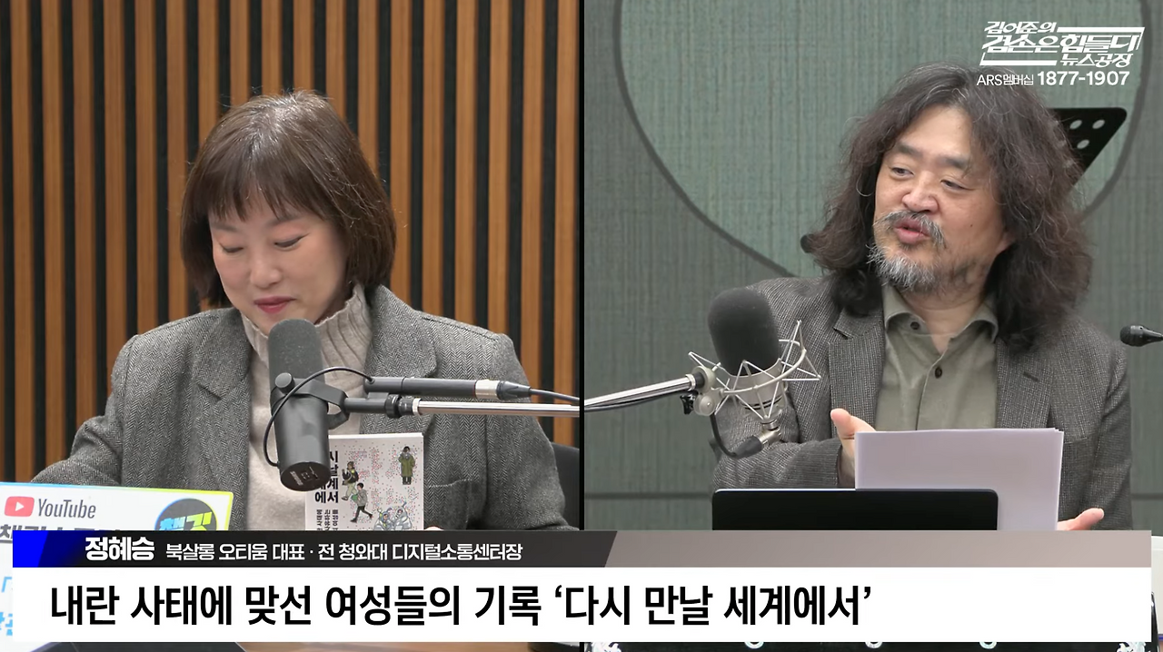 그 많은 12.3 책 중 두번째로 소개할 책은 <다시 만날 세계에서>. ‘빛의 혁명을 이끄는 여성들의 이야기’, 부제가 ‘내란 사태에 맞서고 사유하는 여성들’이야. 응원봉을 들고 광장의 주축이 된 여성들 이야기가 지난 1년 상대적으로 적었다고 생각해. 어른 남성들의 단독 저서가 엄청 쏟아졌는데, 여성들 이야기가 별로 없더라고. 그래서 더 귀한 책이지. 겸공에서 짧게 소개됐었지만, 그 다시 한번 꺼내든 이유야.