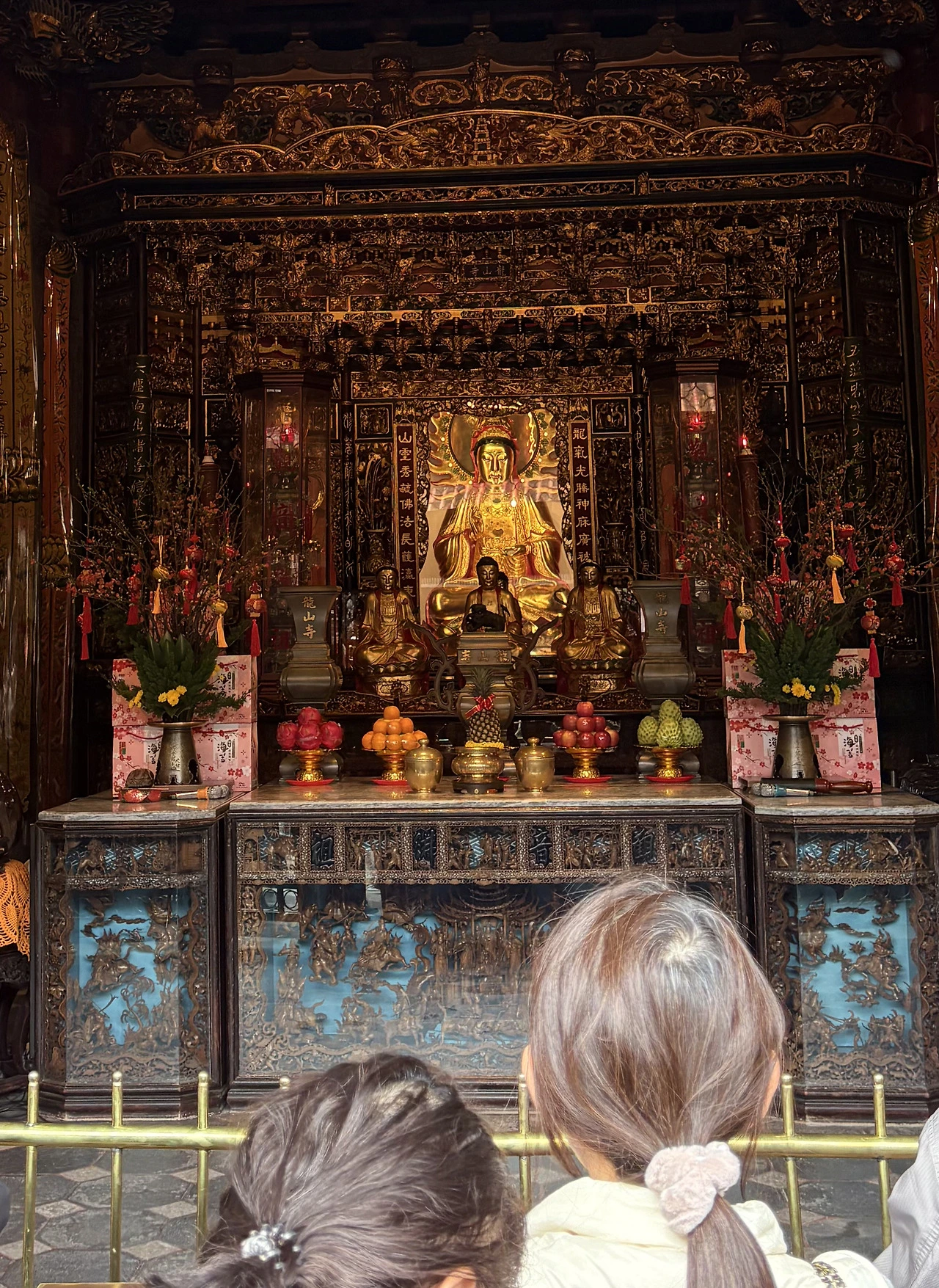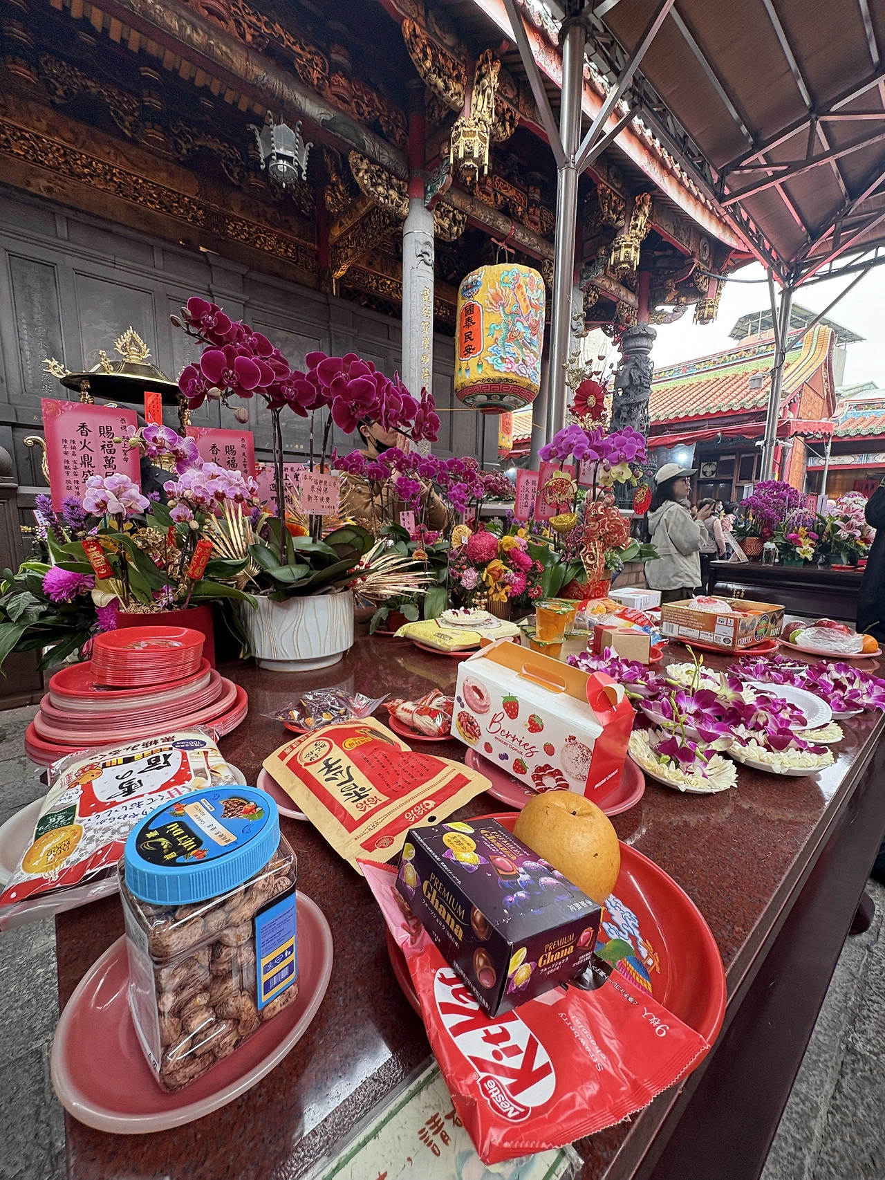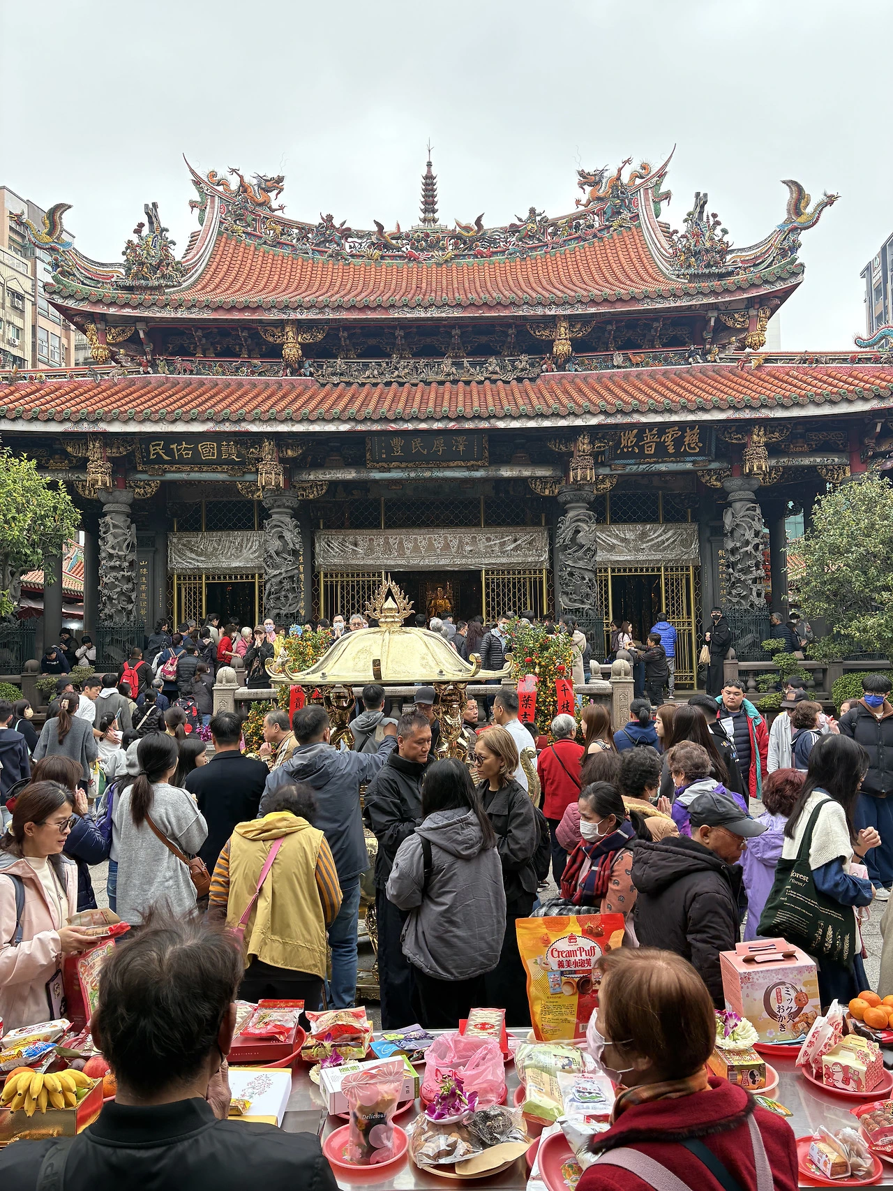 과자와 음료, 과일, 꽃 등 뭔가 제물을 바치면서 부처님 뿐 아니라 그 옆에 관운장 등 도교의 여러 신들에게 기도한다. 무병장수 기원하면 도교라는데, 대만 사람들은 종교적 관용과 포용이 남다른 것일까. 대표 사찰에 두 종교가 공존하다니.
