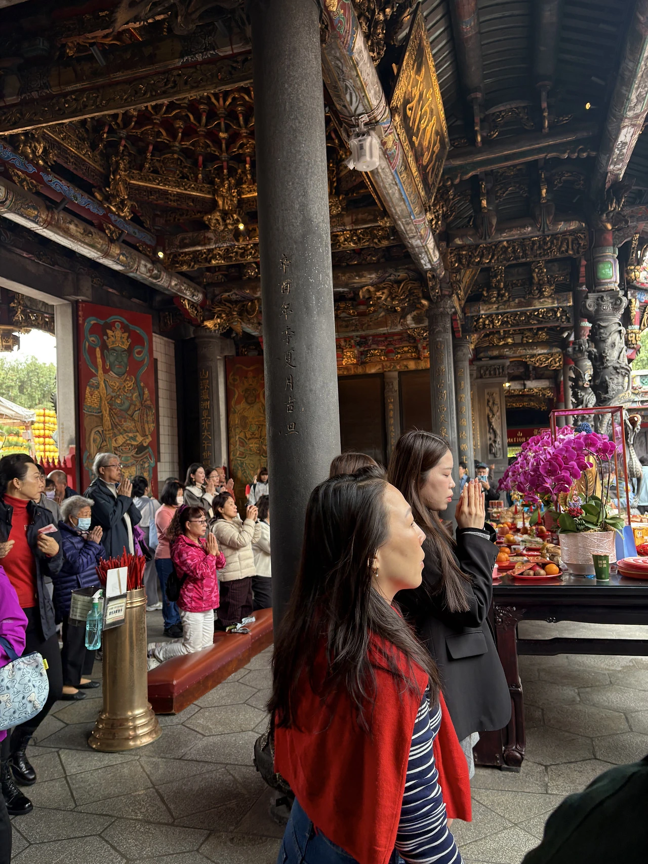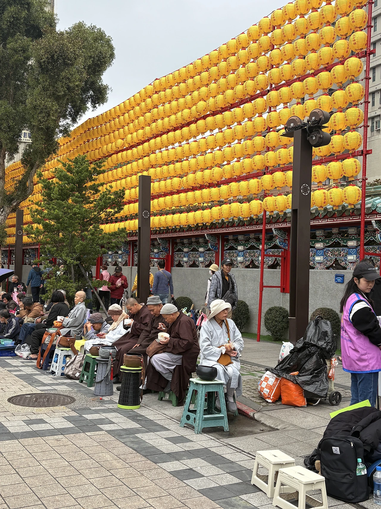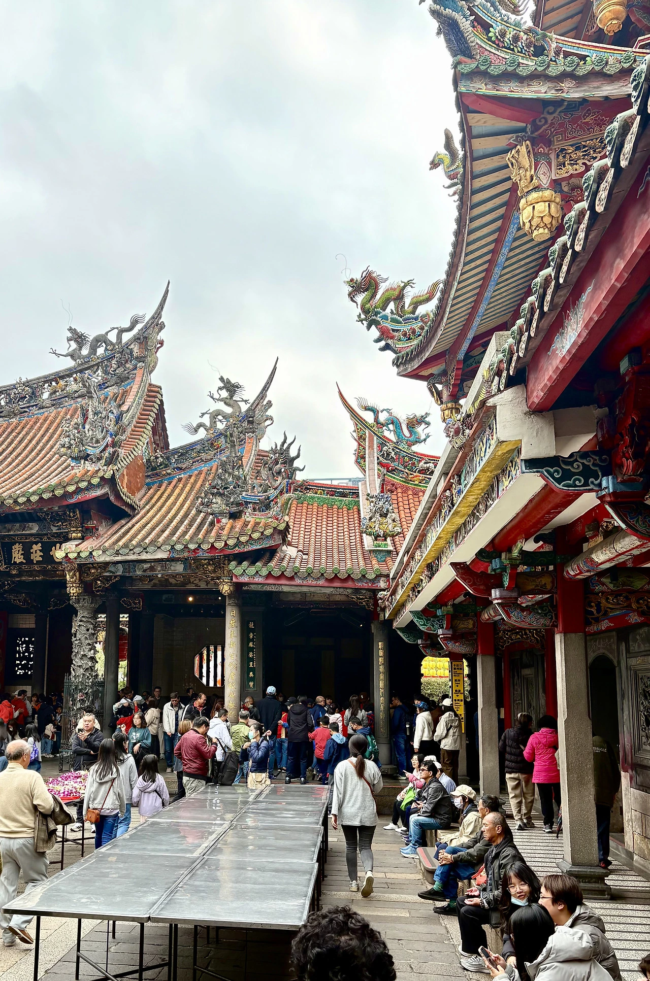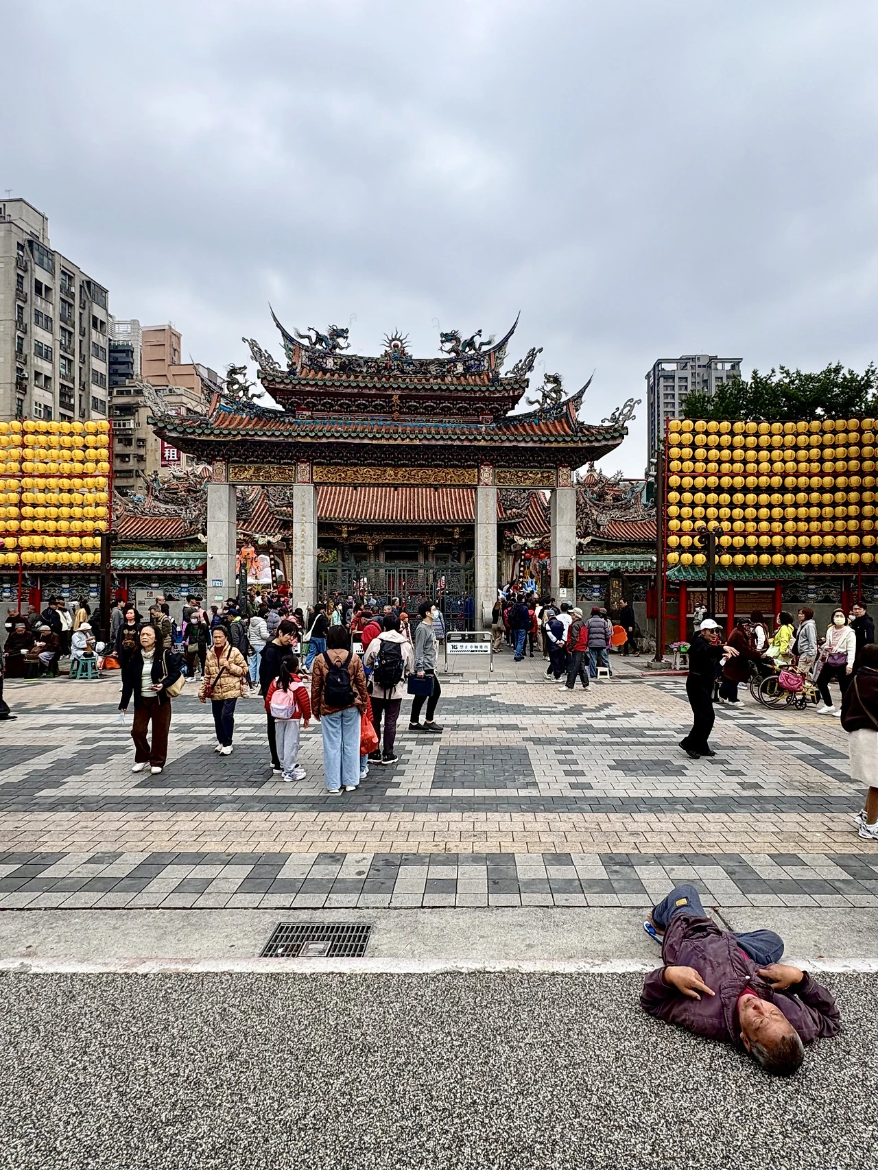 다음 목표는 용산사. 대만은 불교와 도교를 함께 믿는데, 이 절은 두 종교를 다 품었다. 절 앞에 누워계신 분, 뭔가 요상한 분위기로 줄지어 앉아계신 승려 분들도 분위기 남달랐지만 오늘은 마침 연휴. 새해 복을 비는 참배객들로 북새통이었다.
