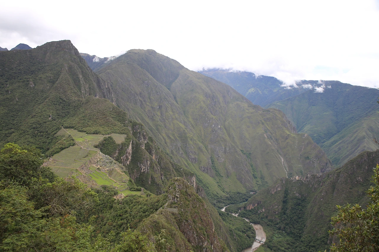 등반 중 자꾸 뒤를 돌아보게 되었다. 우리가 걸었던 마추픽추의 전경이 보였고, 왼쪽으로는 버스가 올라온 지그재그 도로가 마치 다섯 개의 뾰족한 펜촉처럼 보였다. 오른쪽으로는 우르밤바강이 크게 휘돌아 나가는 모습이 대조적으로 눈에 들어왔다. 강은 왼쪽에서도 보였는데, 와이나피추를 크게 돌아서 흘러가고 있었다.