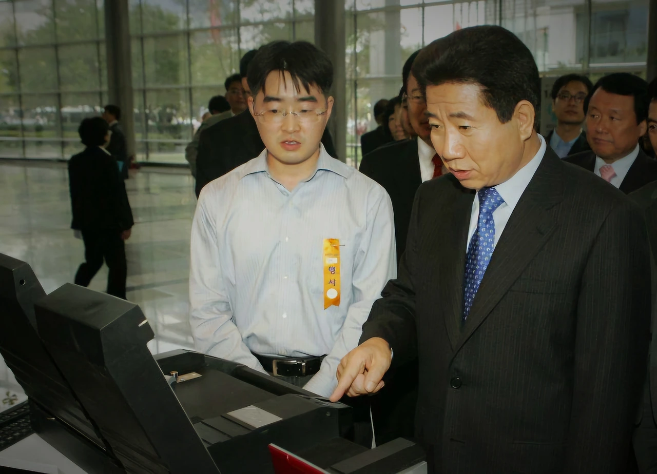 화기애애한 분위기에서 40여분의 임석 시간을 마친 대통령은 앞열에 위치한 참석자들과 악수를 나누며 행사장을 떠나신다. 영송 준비를 하기 위해 출입구 쪽에 먼저 위치해 있던 나를 발견한 노무현 대통령은 내 가슴에 스텝 비표가 달린 걸 보고서는,