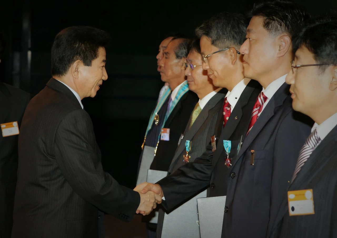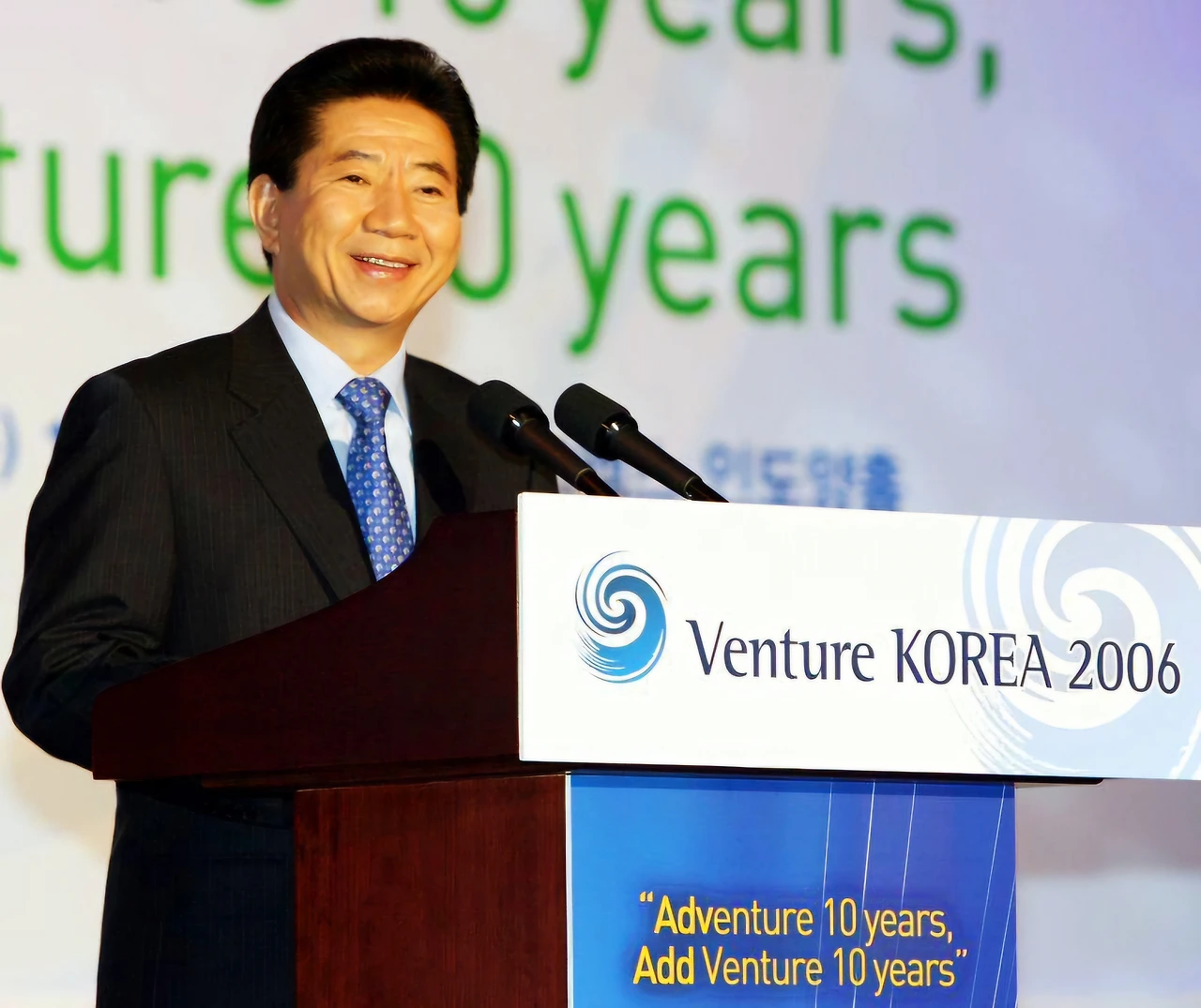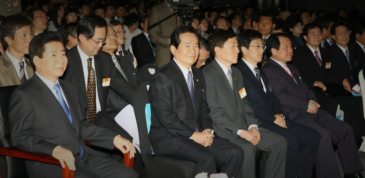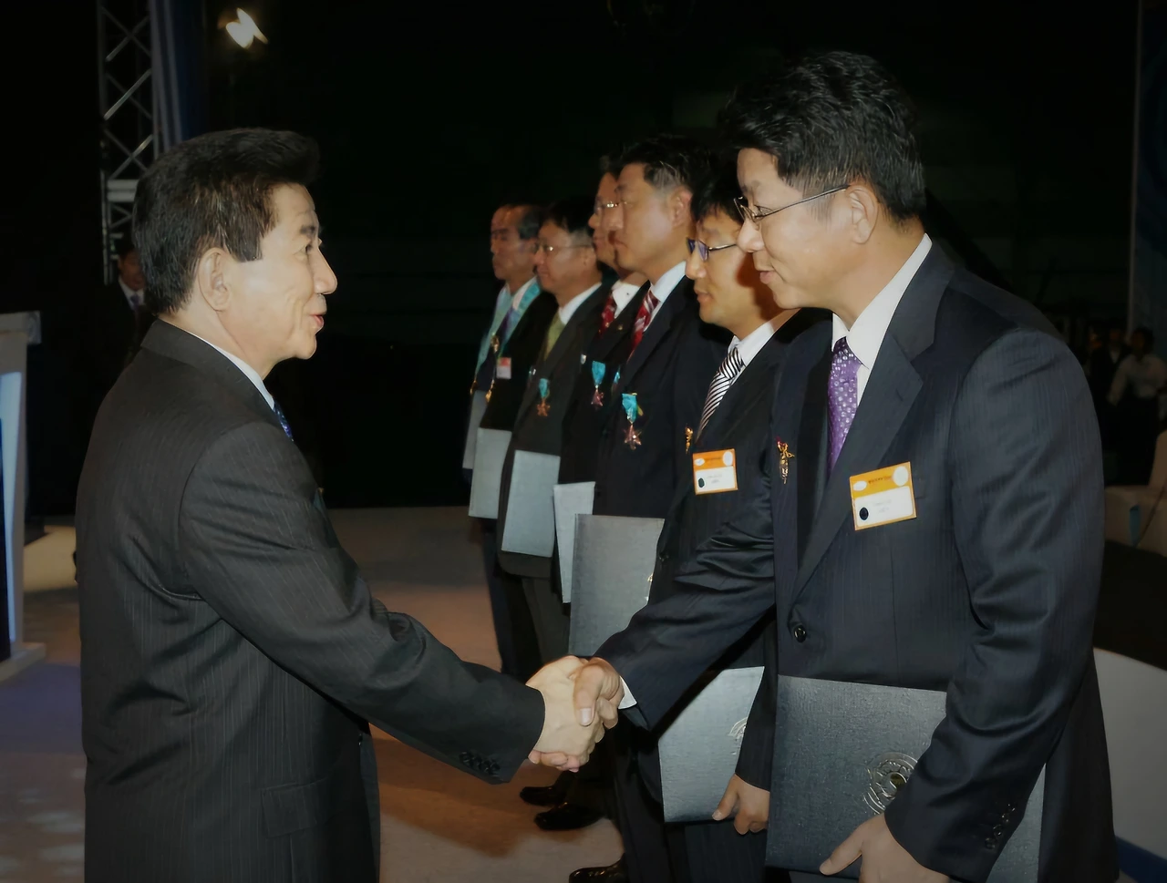 친수 시상을 마친 노무현 대통령이 벤처산업 탄생 10주년과 미래 10년의 성장을 다지는 비전 선포식에 임하신 후 벤처기업인들에게 격려사를 해주신다.