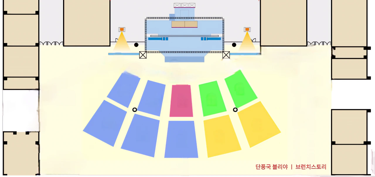 "자 보세요. 위아래에 있는 기둥의 위치와 기둥 바깥쪽 공간을 보세요. 현재 위쪽에 있는 기둥들 뒷공간이 아래쪽보다 더 좁죠? 스테이지를 위에 있는 두 기둥사이로 넣고 무대 양쪽 윙을 기둥 앞으로 빼보세요. 그럼 기둥 두 개가 가려지죠. 영상은 뒤에서 나갈 거니까 스크린과의 거리는 충분히 나와요. 영상이 기둥에 걸리지 않게 실장님이 스크린 위치랑 윙 각도는 맞춰보세요. 이렇게 하면 행사장을 더 넓게 쓸 수 있어요."