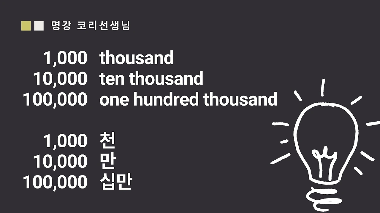 한국인이 숫자를 세는 단위가 '만(10000)'이라고 했을 때 나는 선뜻 이해가 가지 않았다. 한국도 분명 세 자리마다 콤마를 찍는데 말이다. 칠판에 숫자를 써가며 해주는 설명을 듣고 나서야 이해가 됐다.