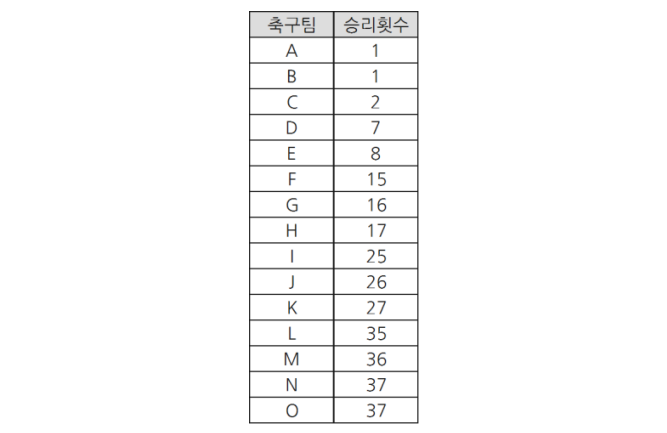 문장 해석만으로는 쉽게 이해되지 않는 부분이 있어, 다음과 같이 가상의 예시를 만들어보았습니다. 임의로 축구팀 A부터 O까지 15개 팀의 승리 횟수를 적어보았습니다.