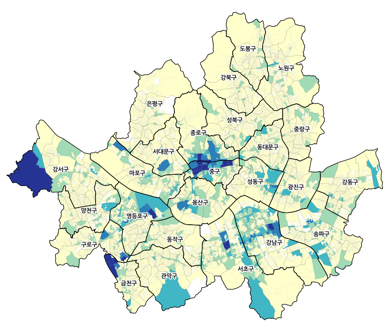 주관적인 방법임에도 불구하고 앞서 서울시 사업체종사자 지도에서 확인한 바와 같이, 실제적인 현상을 설명하기에 훌륭한 방법임에는 틀림없습니다. 기존 연구에서도 Jenks 최적화 알고리듬(Jenks optimal algorithm)은 정량화할 수 있는 동질성(quantifiable homogenetity)과 통계적 클러스터 개념(cluster concept in statistics)을 기초로 한 최적화된 등급화(classification) 방법이라고 증명된 바가 있습니다.