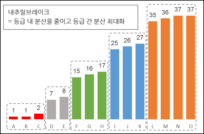 등간격으로 등급을 나누어보았습니다. 가장 많은 승리를 거둔 팀이 37승, 적은 팀이 1승으로 총 36승의 차이가 나고, 5등간으로 나누면 7.2가 동일한 간격이 됩니다. 등간격 방식으로는 1등급에 L, M, N, O 4개의 팀이 해당되고, 4등급에는 F팀 하나가 분배됩니다. 그리고 5등급에는 A~E 다섯 개 팀이 해당되게 됩니다. 이 방식에서도 F팀과 G팀은 불과 1점 차이로 서로 다른 등급으로 구분이 됩니다.