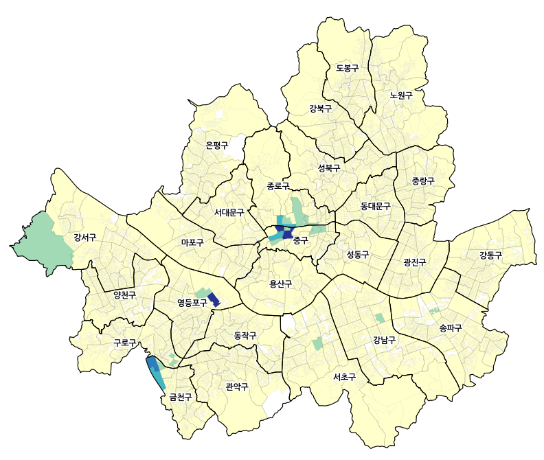 먼저 등간격으로 구분한 사업체종사자 지도입니다. 중구의 일부 지역, 영등포구 여의도, 금천구의 가산디지털단지 등 몇몇 지역을 제외하고는 아무도 일하지 않는 황무지처럼 표현됩니다. 조금 더 자세히 살펴보겠습니다.