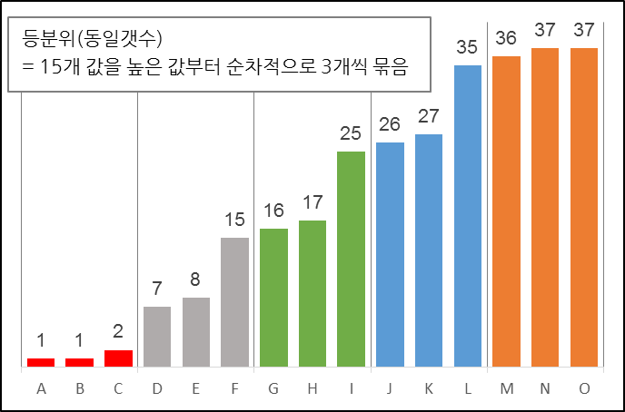 먼저 등분위로 등급을 나누어보았습니다. 위의 차트처럼 3개씩 묶이게 됩니다. 등분위로 등급을 구분하게 되면, 승리 횟수를 기준으로 F, I, L 팀은 바로 단 1승 차이로 바로 상위권에 있는 G, J, M과 다른 등급에 묶입니다. 동일한 개수로 구분되는 장점은 있으나, 보기와 같이 막대차트가 아닌 색상만으로 인지한다면 F, I, L 세 팀의 실제 승리 횟수에 대해서는 올바르게 인식하기가 쉽지 않아 보입니다.