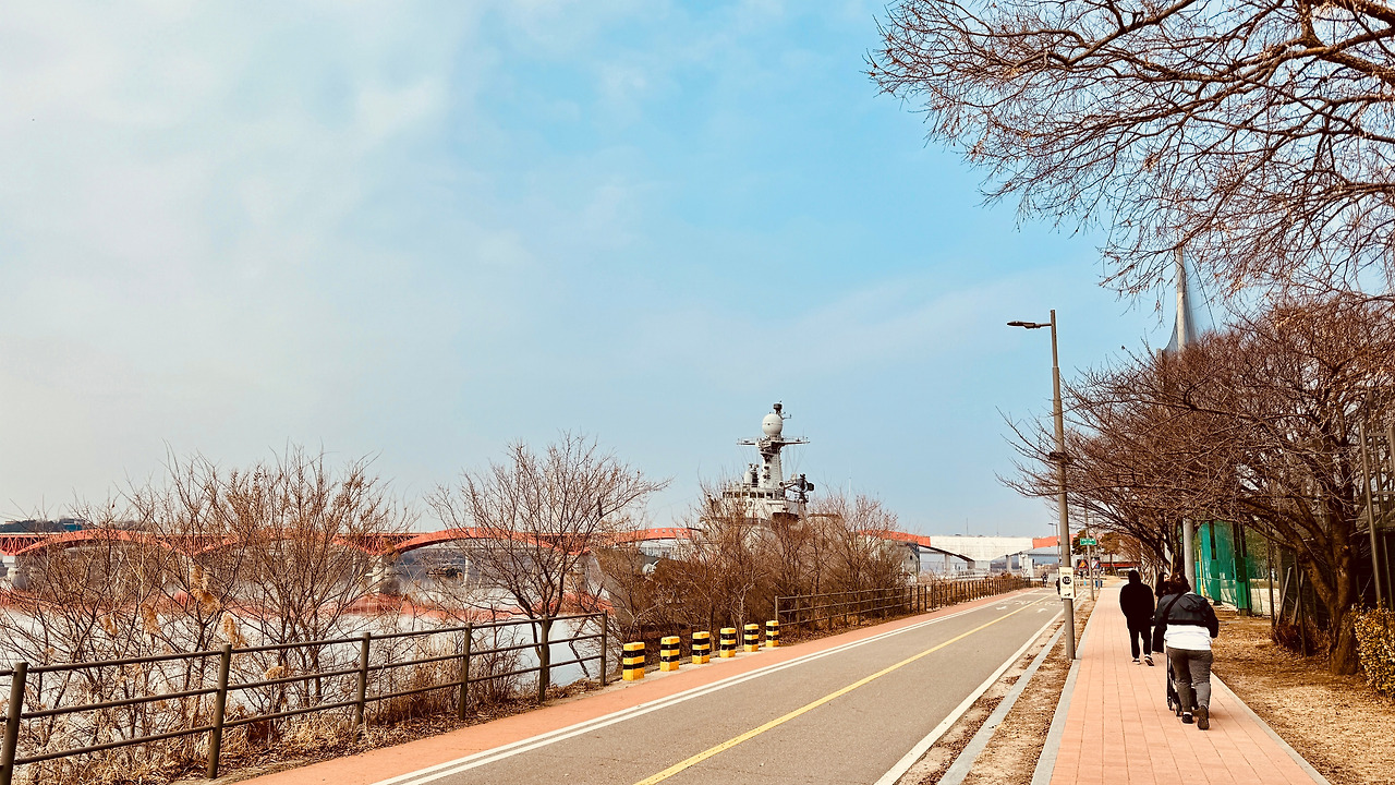 양화대교북단을 지나 이제 성산대교로 향한다. 성산대교에 이르면 가장 먼저 눈에 띄는 것이 서울함 공원의 ’서울함‘이다. 1985년 건조되어 취역한 대한민국 최초의 국산 호위함이다. 저 멀리서도 웅장한데, 가까이서 보면 그 정교함에 감탄하게 된다. 길이는 100미터가 넘고 승조원도 최대 105명까지 태울 수가 있다. 사실 난, 그 위까지 올라가 보지는 못했다. 유료인 이유도 있고, 걷는 데에 집중하다 보면 그냥 지나쳐버리기 일쑤다.