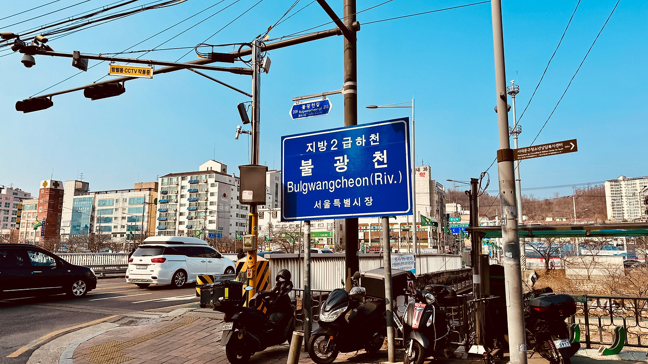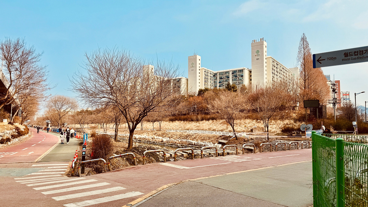 성산대교 남단을 지나면 곧바로 한강으로 합류하는 ‘홍제천’을 만난다. 홍제천을 따라 약 700여 미터를 올라가면 불광천과 합류하는 성산교에 이르게 된다. 그동안은 홍제천을 따라 연희동이나 서대문까지 걸어가 보았지만, 오늘은 홍제천과 합류하는 불광천을 따라 빠져나갔다. 지상에서만 보았던 서울월드컵경기장을 불광천 아래에서 올려다보니 새롭다. 불광천변을 따라 한참을 걸어 6호선 ‘증산역’까지 온 뒤, 불광천 도로 위로 올라왔다. 이제 북가좌동 마을로 들어가야 한다.